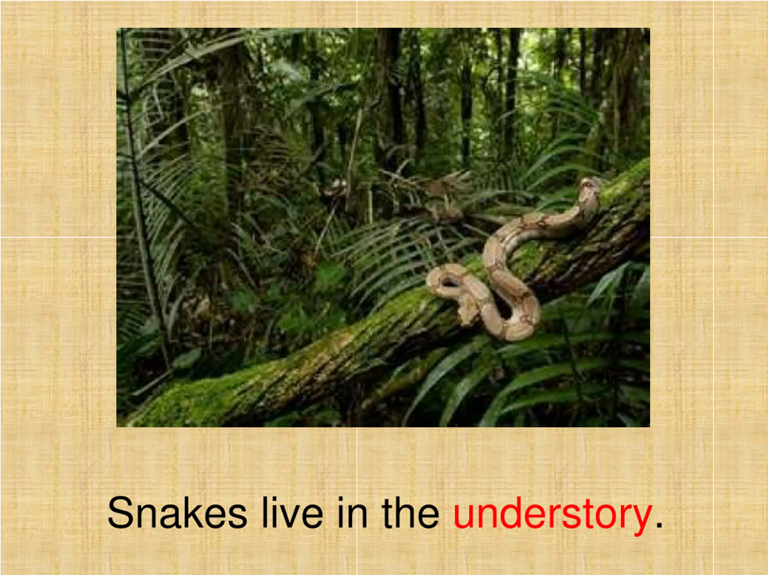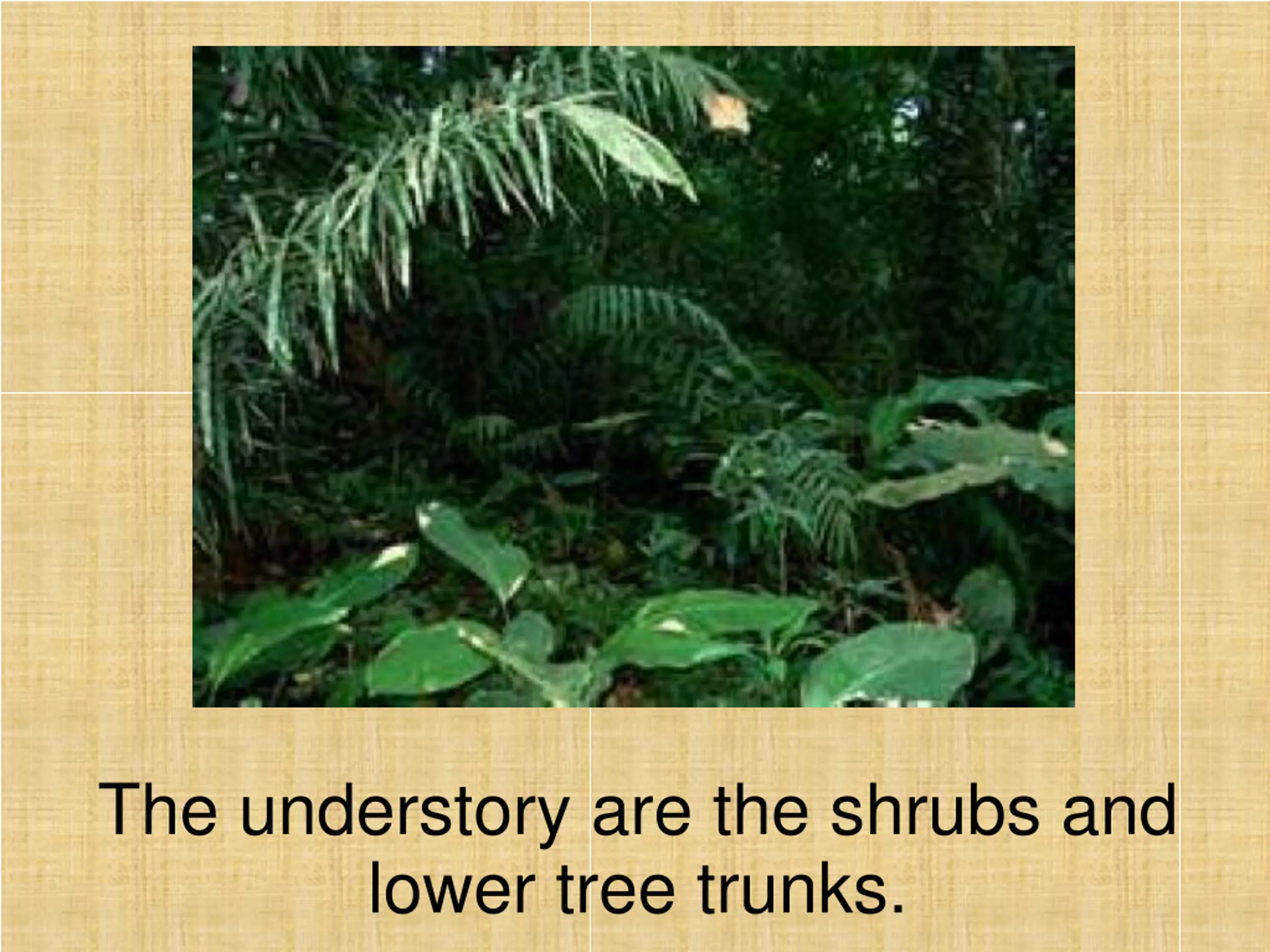 The understory are the shrubs and lower tree trunks.