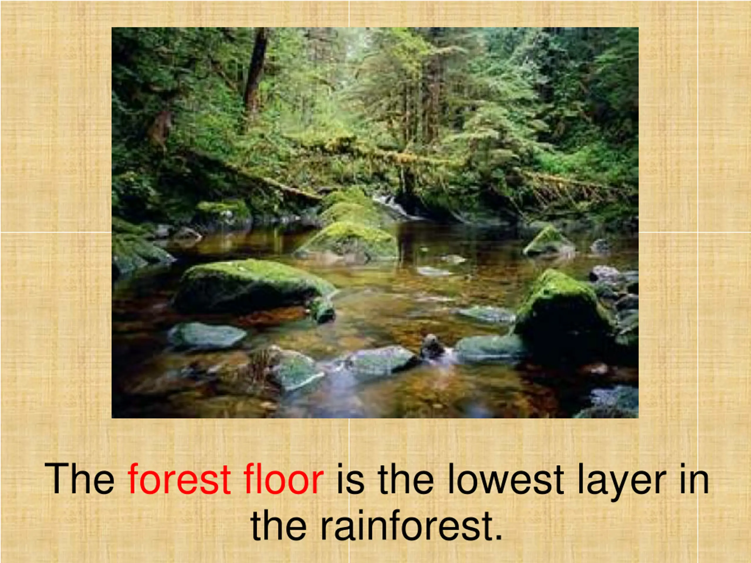 The forest floor is the lowest layer in the rainforest.