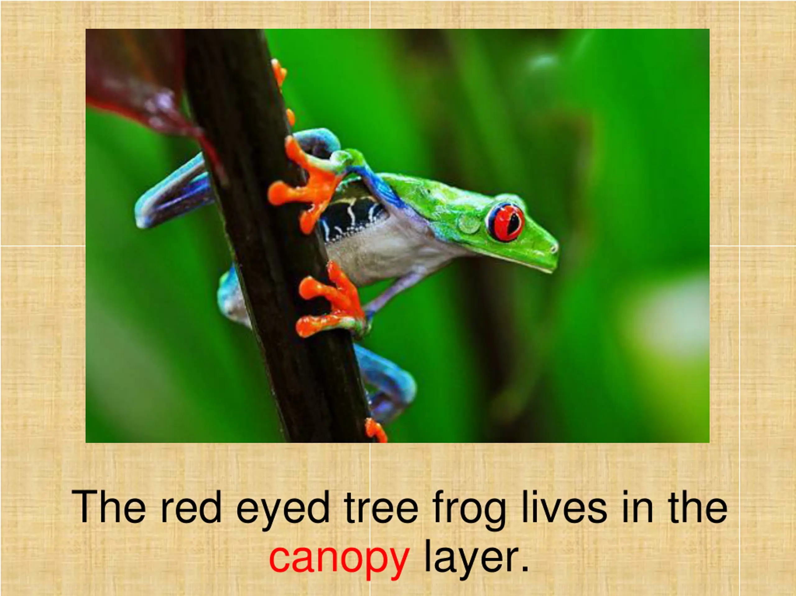The red eyed tree frog lives in the canopy layer.