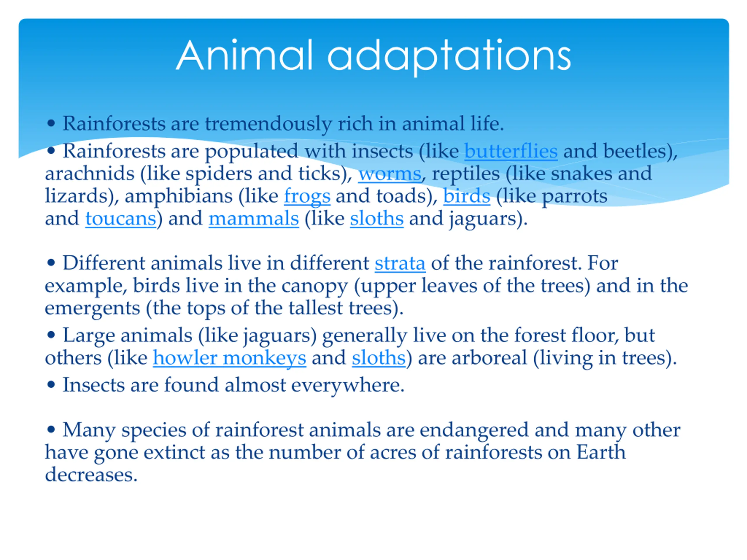 Animal adaptations Rainforests are tremendously rich in animal life. Rainforests are populated with insects (like butterflies and beetles), arachnids (like spiders and ticks), worms, reptiles (like snakes and lizards), amphibians (like frogs and toads), birds (like parrots and toucans) and mammals (like sloths and jaguars). Different animals live in different strata of the rainforest. For example, birds live in the canopy (upper leaves of the trees) and in the emergents (the tops of the tallest trees). Large animals (like jaguars) generally live on the forest floor, but others (like howler monkeys and sloths) are arboreal (living in trees). Insects are found almost everywhere. Many species of rainforest animals are endangered and many other have gone extinct as the number of acres of rainforests on Earth decreases.