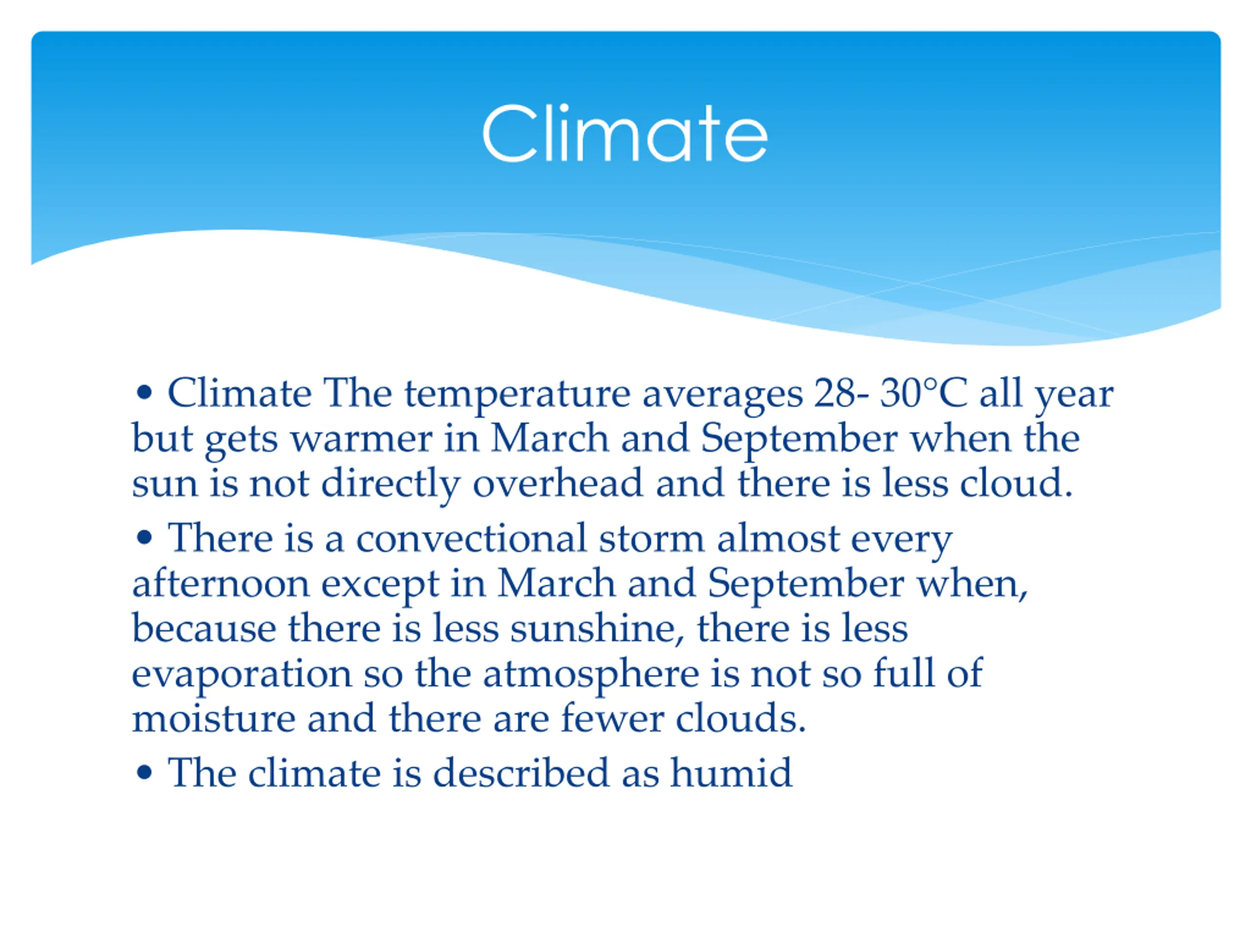 Climate Climate The temperature averages 28- 30 C all year but gets warmer in March and September when the sun is not directly overhead and there is less cloud. There is a convectional storm almost every afternoon except in March and September when, because there is less sunshine, there is less evaporation so the atmosphere is not so full of moisture and there are fewer clouds. The climate is described as humid