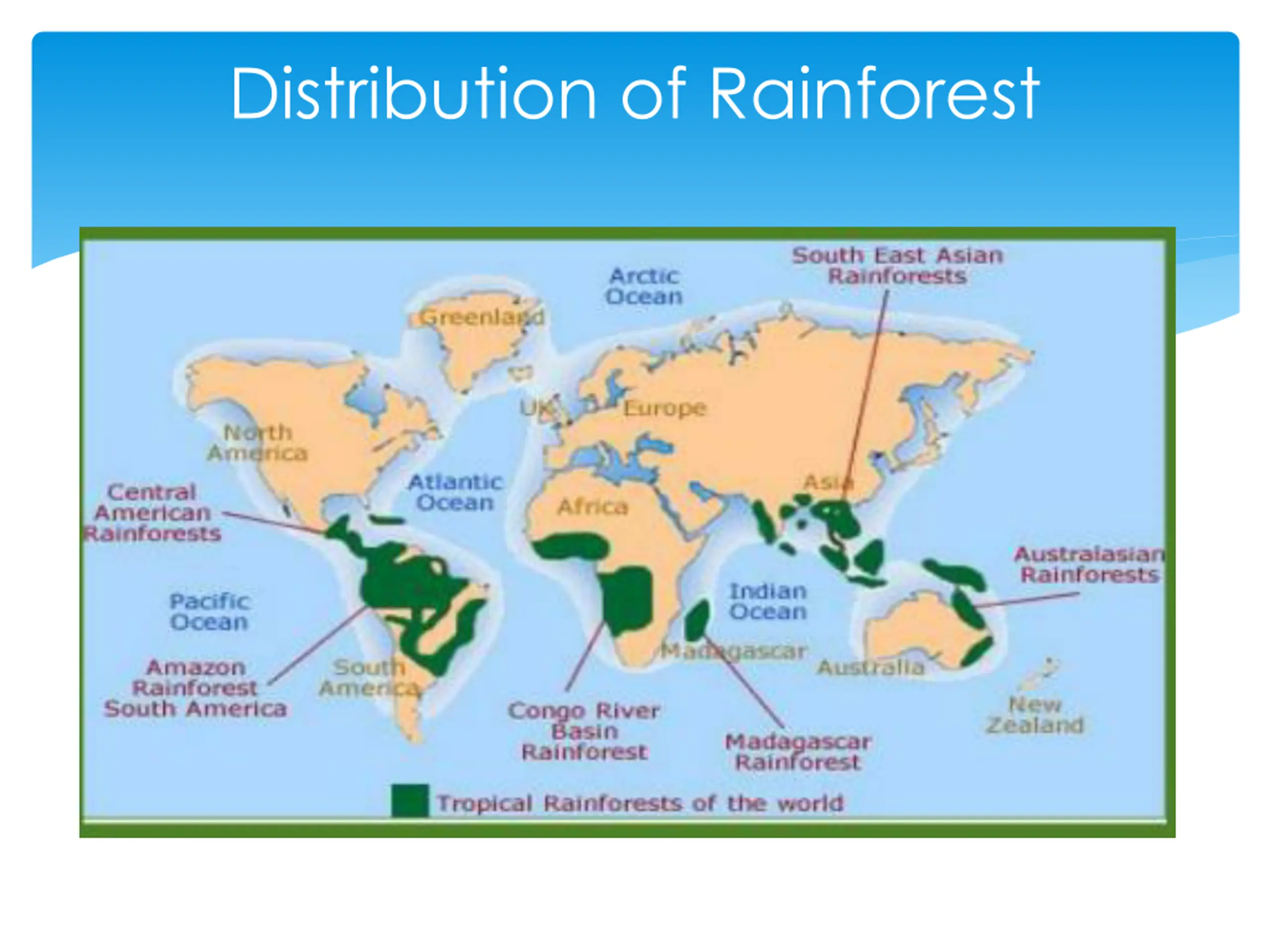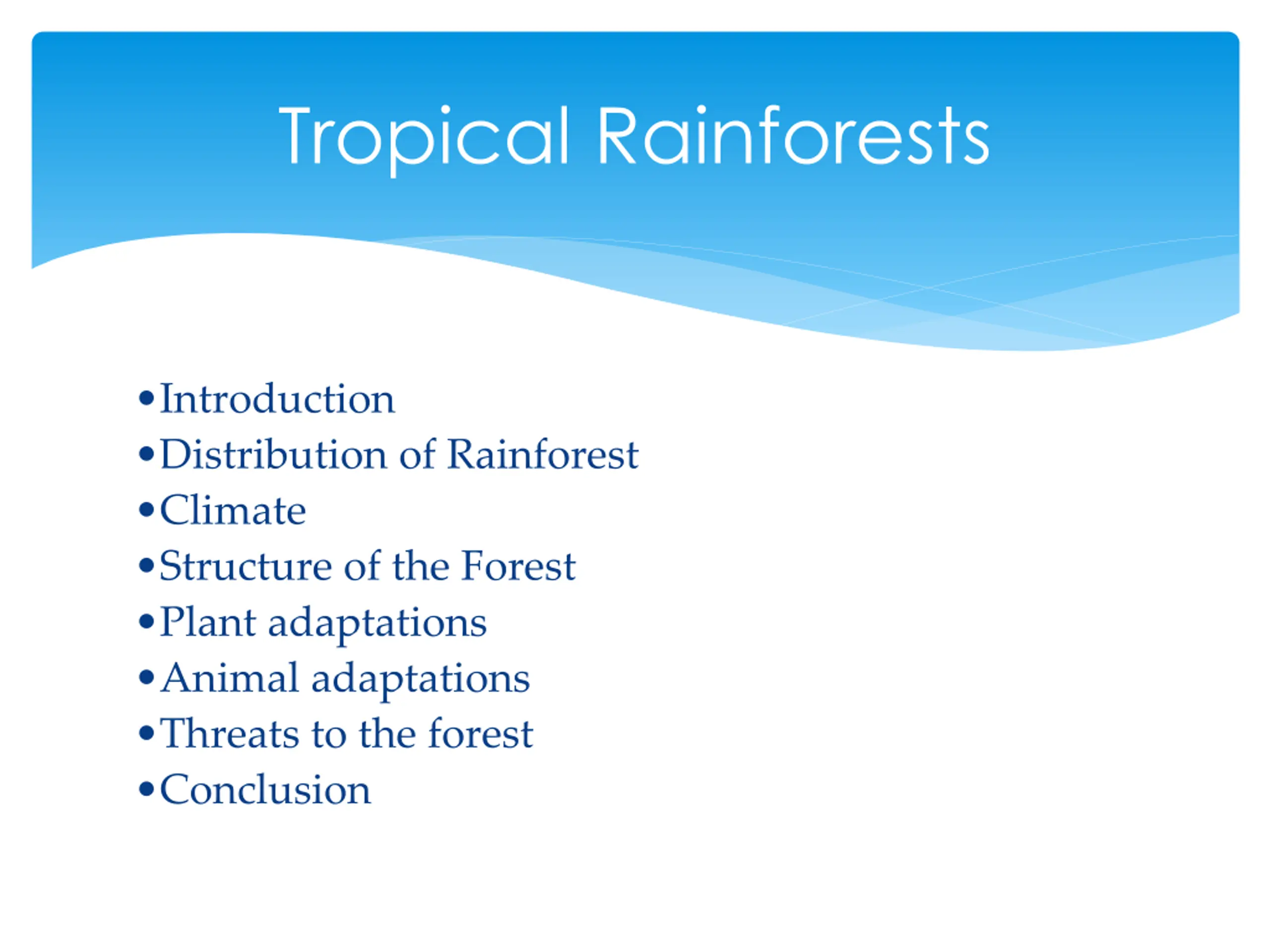 Tropical Rainforests Introduction Distribution of Rainforest Climate Structure of the Forest Plant adaptations Animal adaptations Threats to the forest Conclusion