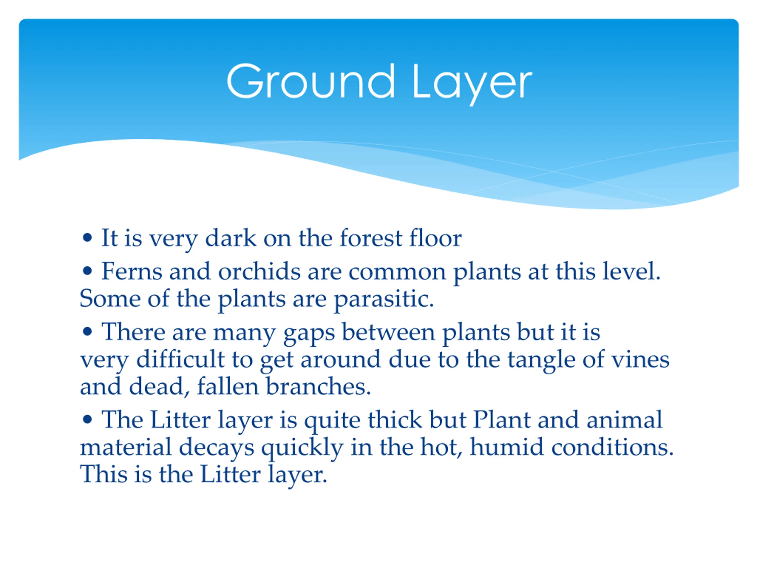 Ground Layer It is very dark on the forest floor Ferns and orchids are common plants at this level. Some of the plants are parasitic. There are many gaps between plants but it is very difficult to get around due to the tangle of vines and dead, fallen branches. The Litter layer is quite thick but Plant and animal material decays quickly in the hot, humid conditions. This is the Litter layer.