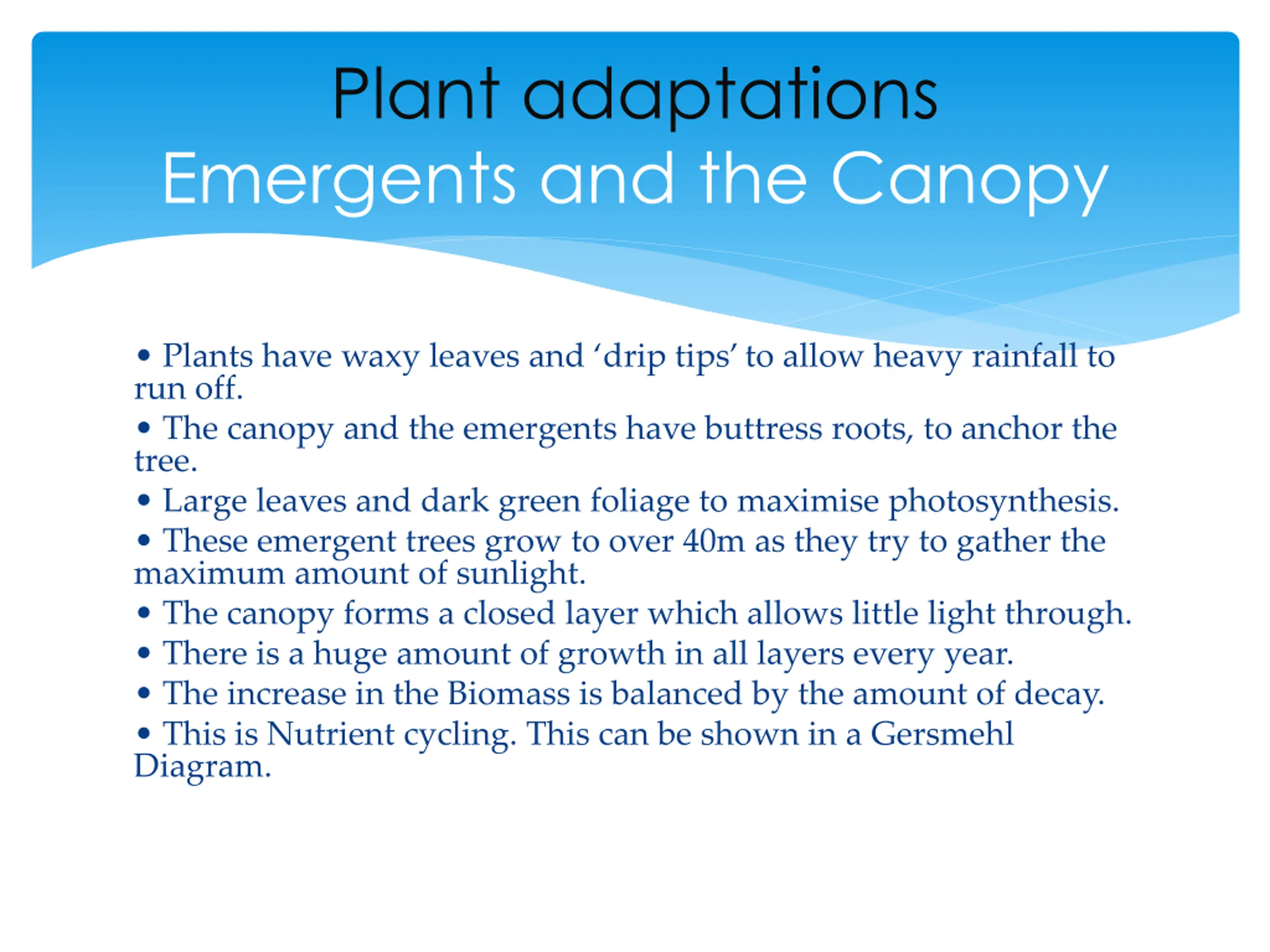 Plant adaptations Emergents and the Canopy Plants have waxy leaves and drip tips to allow heavy rainfall to run off. The canopy and the emergents have buttress roots, to anchor the tree. Large leaves and dark green foliage to maximise photosynthesis. These emergent trees grow to over 40m as they try to gather the maximum amount of sunlight. The canopy forms a closed layer which allows little light through. There is a huge amount of growth in all layers every year. The increase in the Biomass is balanced by the amount of decay. This is Nutrient cycling. This can be shown in a Gersmehl Diagram.