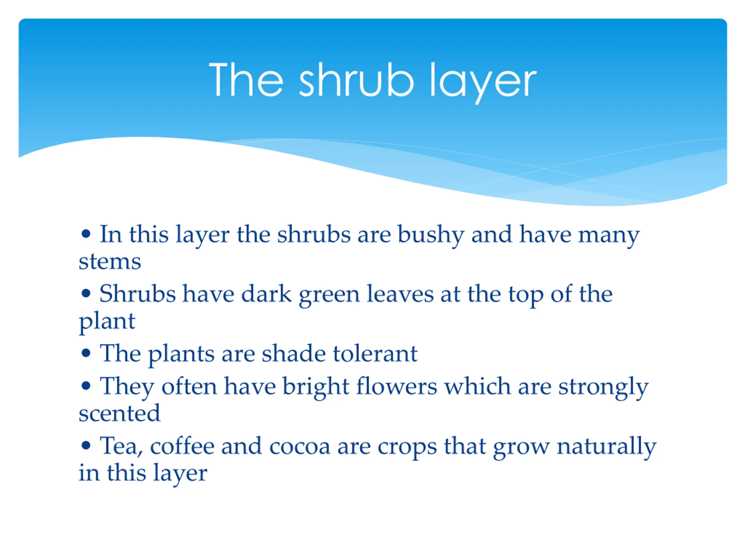 The shrub layer In this layer the shrubs are bushy and have many stems Shrubs have dark green leaves at the top of the plant The plants are shade tolerant They often have bright flowers which are strongly scented Tea, coffee and cocoa are crops that grow naturally in this layer