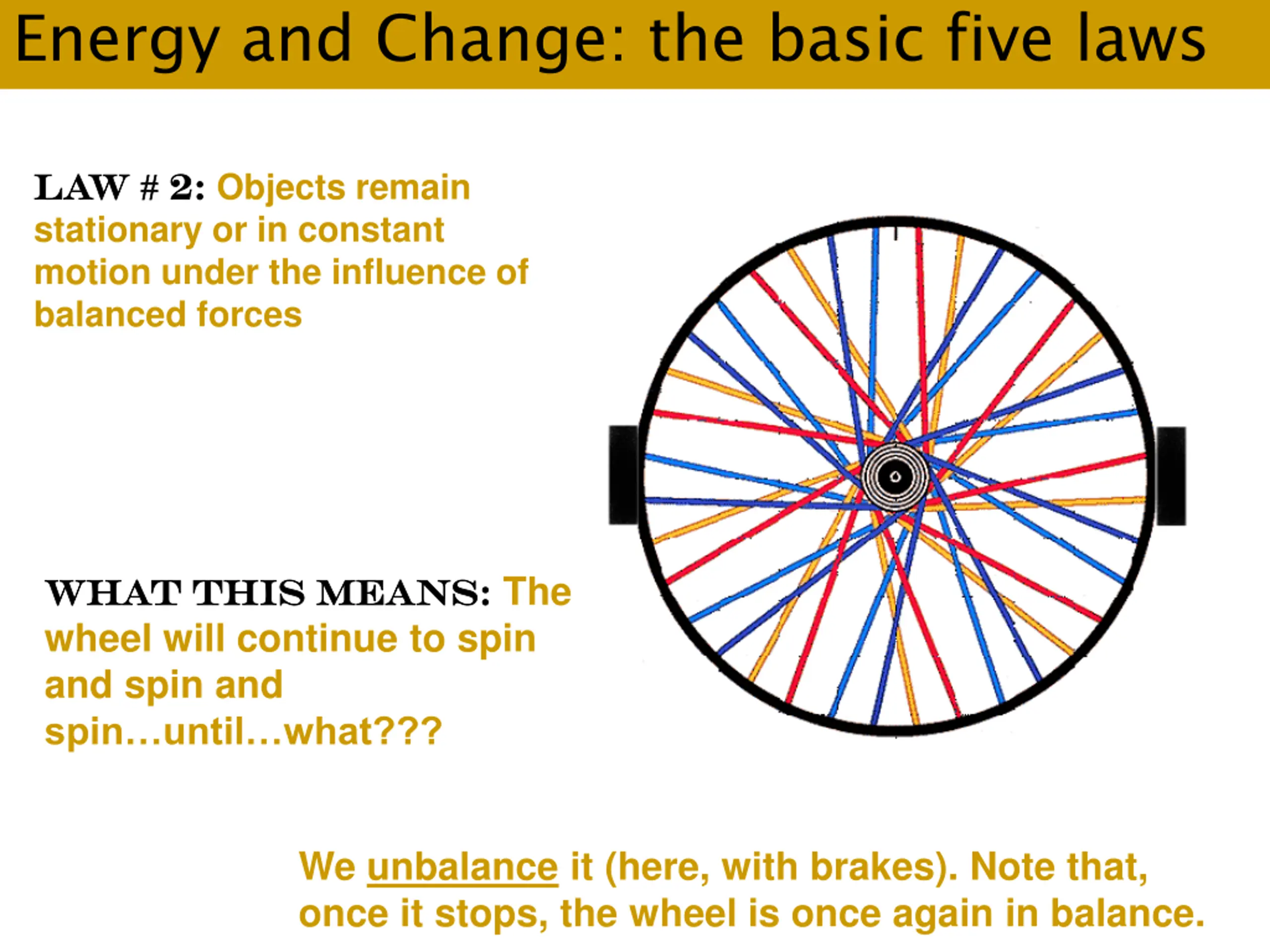 Energy and Change: the basic five laws Law # 2: Law # 2: Objects remain stationary or in constant motion under the influence of balanced forces What this means: What this means:The wheel will continue to spin and spin and spin until what??? We unbalance it (here, with brakes). Note that, once it stops, the wheel is once again in balance.