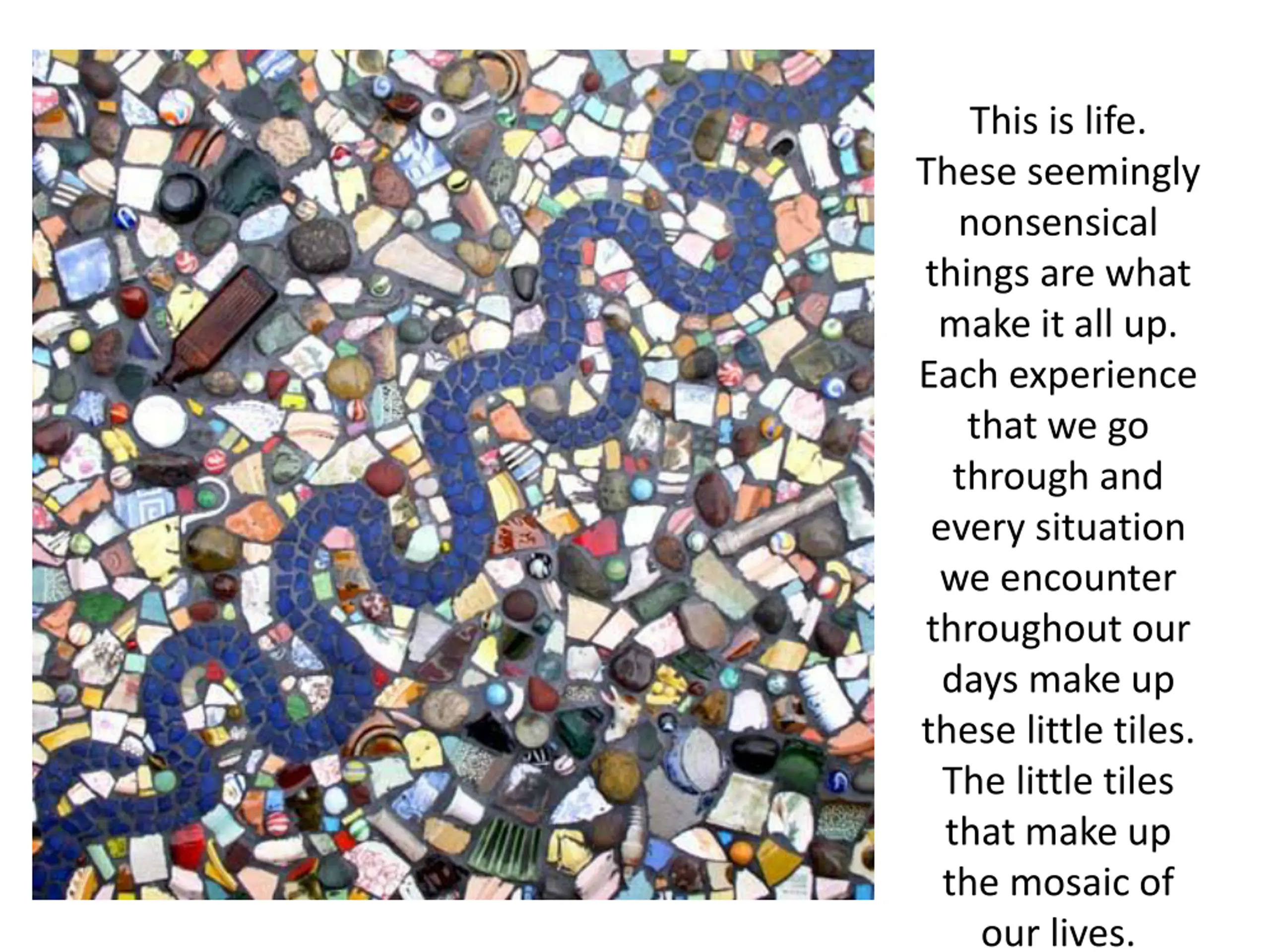 This is life. These seemingly nonsensical things are what make it all up. Each experience that we go through and every situation we encounter throughout our days make up these little tiles. The little tiles that make up the mosaic of our lives.