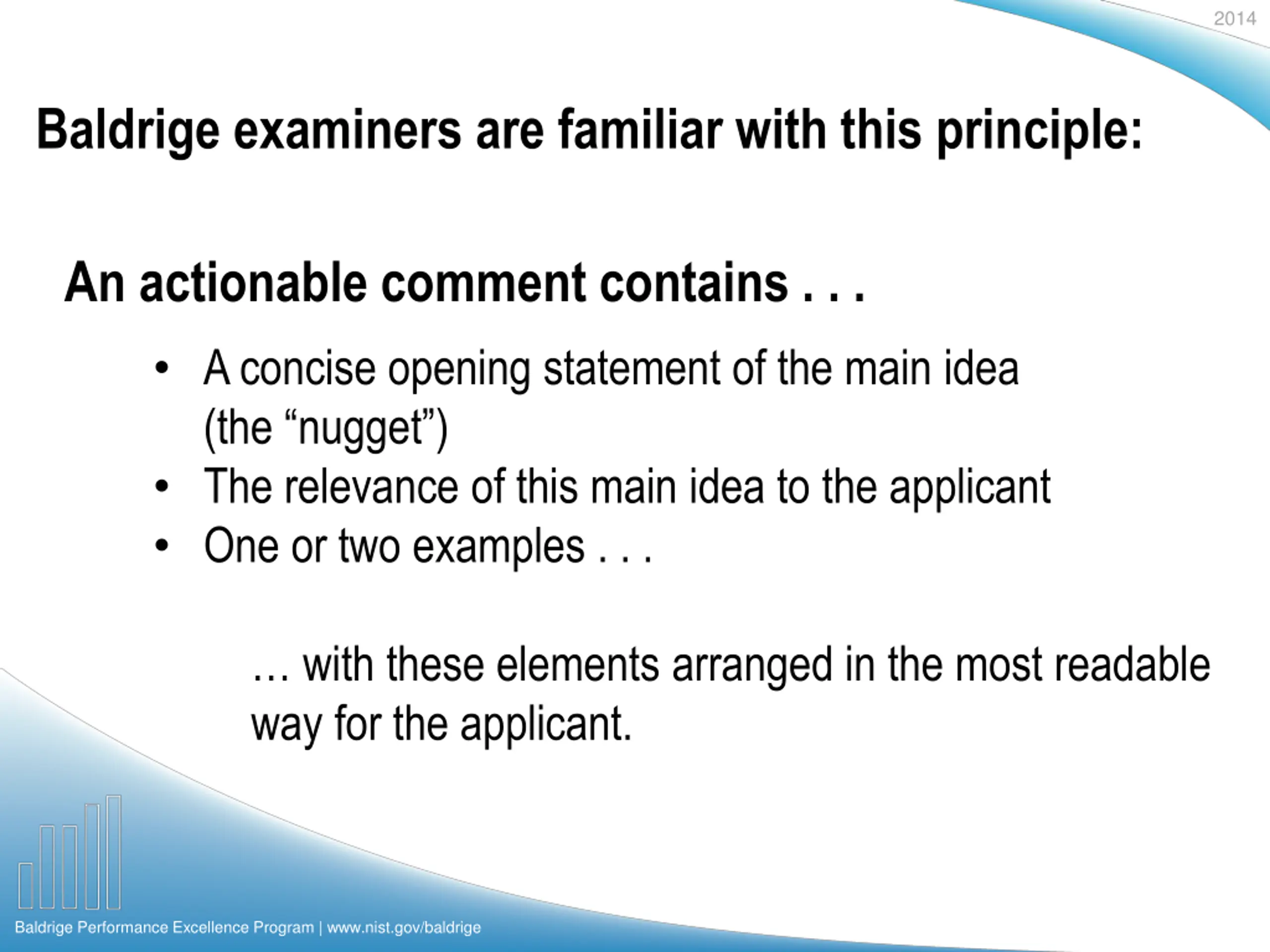 2014 Baldrige examiners are familiar with this principle: An actionable comment contains . . . A concise opening statement of the main idea (the nugget ) The relevance of this main idea to the applicant One or two examples . . . with these elements arranged in the most readable way for the applicant. Baldrige Performance Excellence Program | www.nist.gov/baldrige
