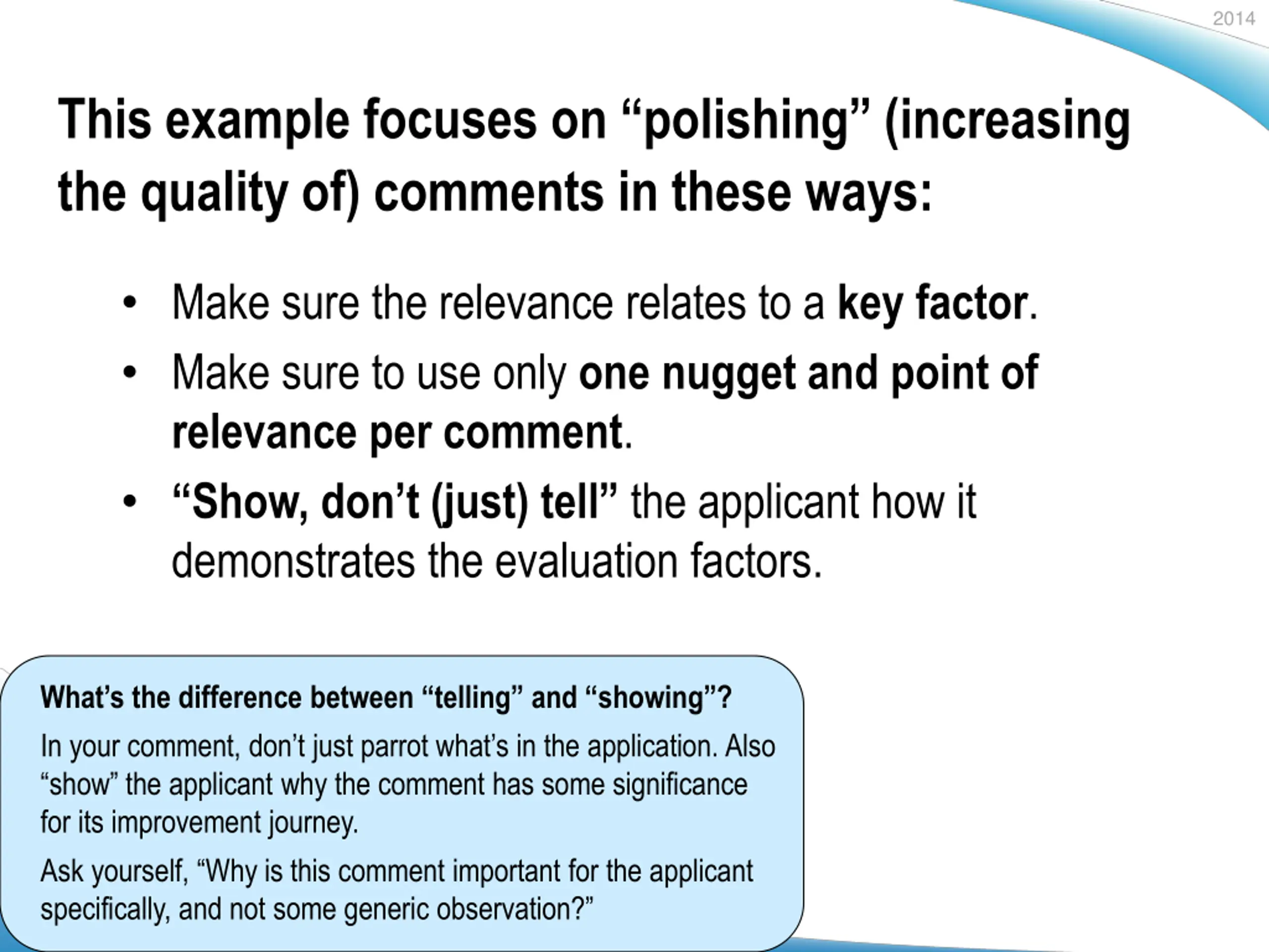2014 This example focuses on polishing (increasing the quality of) comments in these ways: Make sure the relevance relates to a key factor. Make sure to use only one nugget and point of relevance per comment. Show, don t (just) tell the applicant how it demonstrates the evaluation factors. What s the difference between telling and showing ? In your comment, don t just parrot what s in the application. Also show the applicant why the comment has some significance for its improvement journey. Ask yourself, Why is this comment important for the applicant Baldrige Performance Excellence Program | www.nist.gov/baldrige specifically, and not some generic observation?