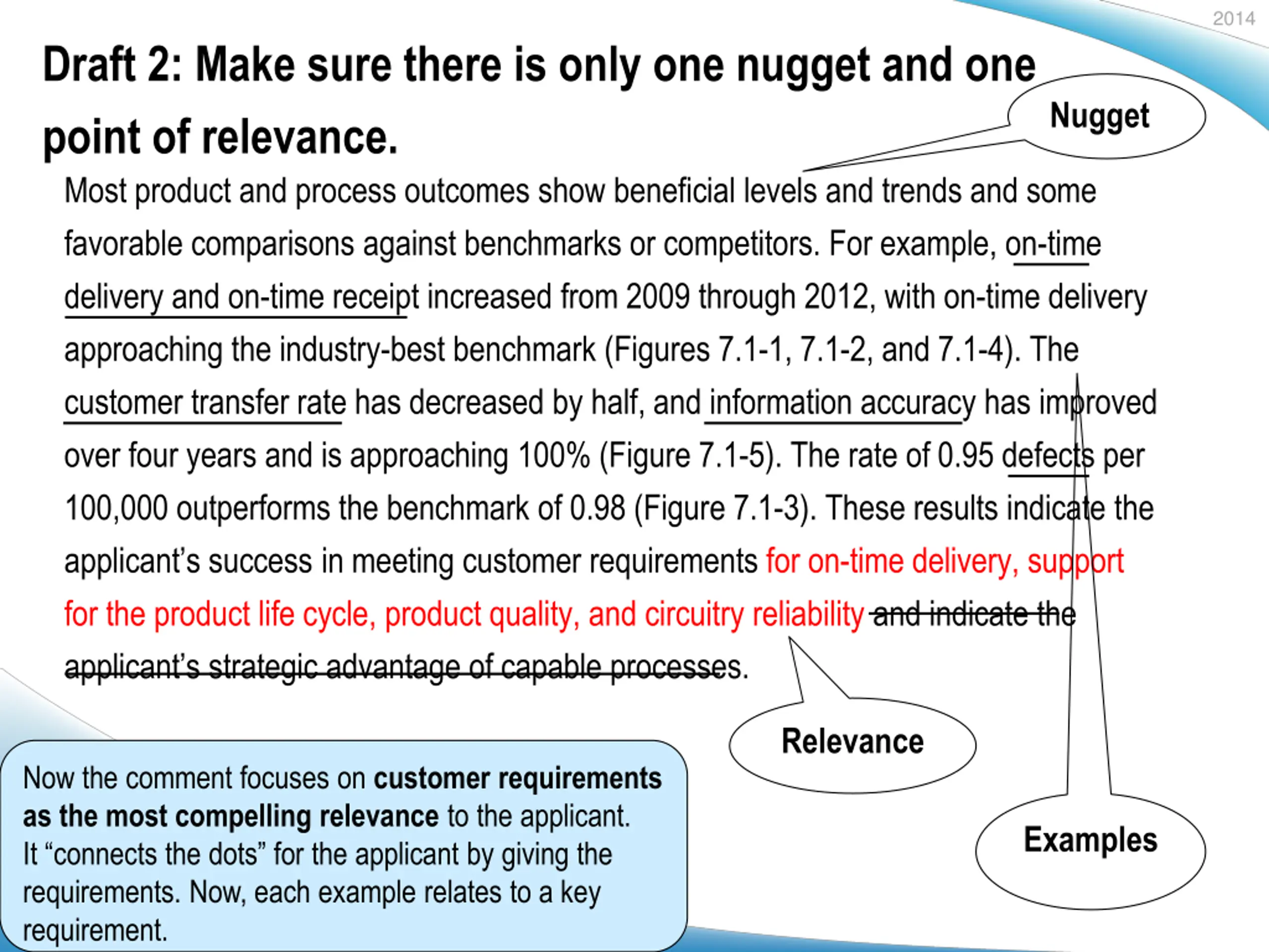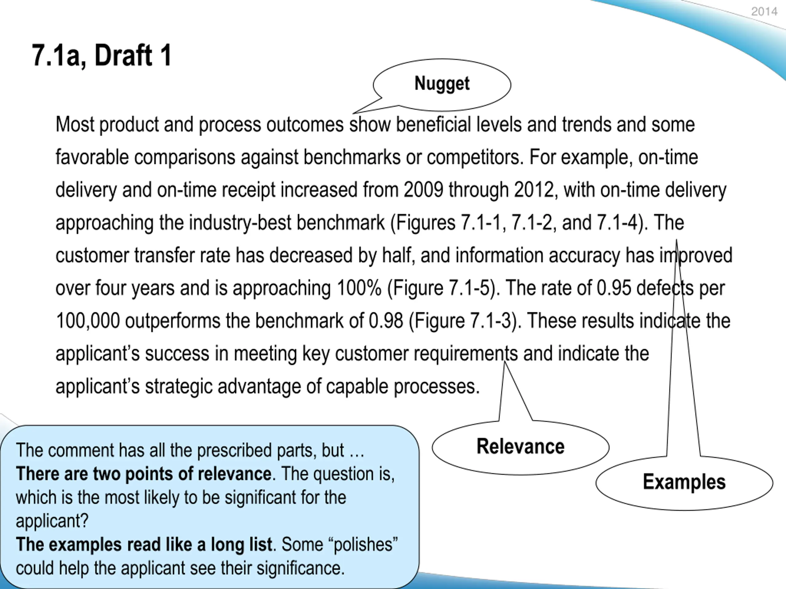 2014 7.1a, Draft 1 Nugget Most product and process outcomes show beneficial levels and trends and some favorable comparisons against benchmarks or competitors. For example, on-time delivery and on-time receipt increased from 2009 through 2012, with on-time delivery approaching the industry-best benchmark (Figures 7.1-1, 7.1-2, and 7.1-4). The customer transfer rate has decreased by half, and information accuracy has improved over four years and is approaching 100% (Figure 7.1-5). The rate of 0.95 defects per 100,000 outperforms the benchmark of 0.98 (Figure 7.1-3). These results indicate the applicant s success in meeting key customer requirements and indicate the applicant s strategic advantage of capable processes. Relevance The comment has all the prescribed parts, but There are two points of relevance. The question is, which is the most likely to be significant for the applicant? The examples read like a long list. Some polishes Examples Baldrige Performance Excellence Program | www.nist.gov/baldrige could help the applicant see their significance.