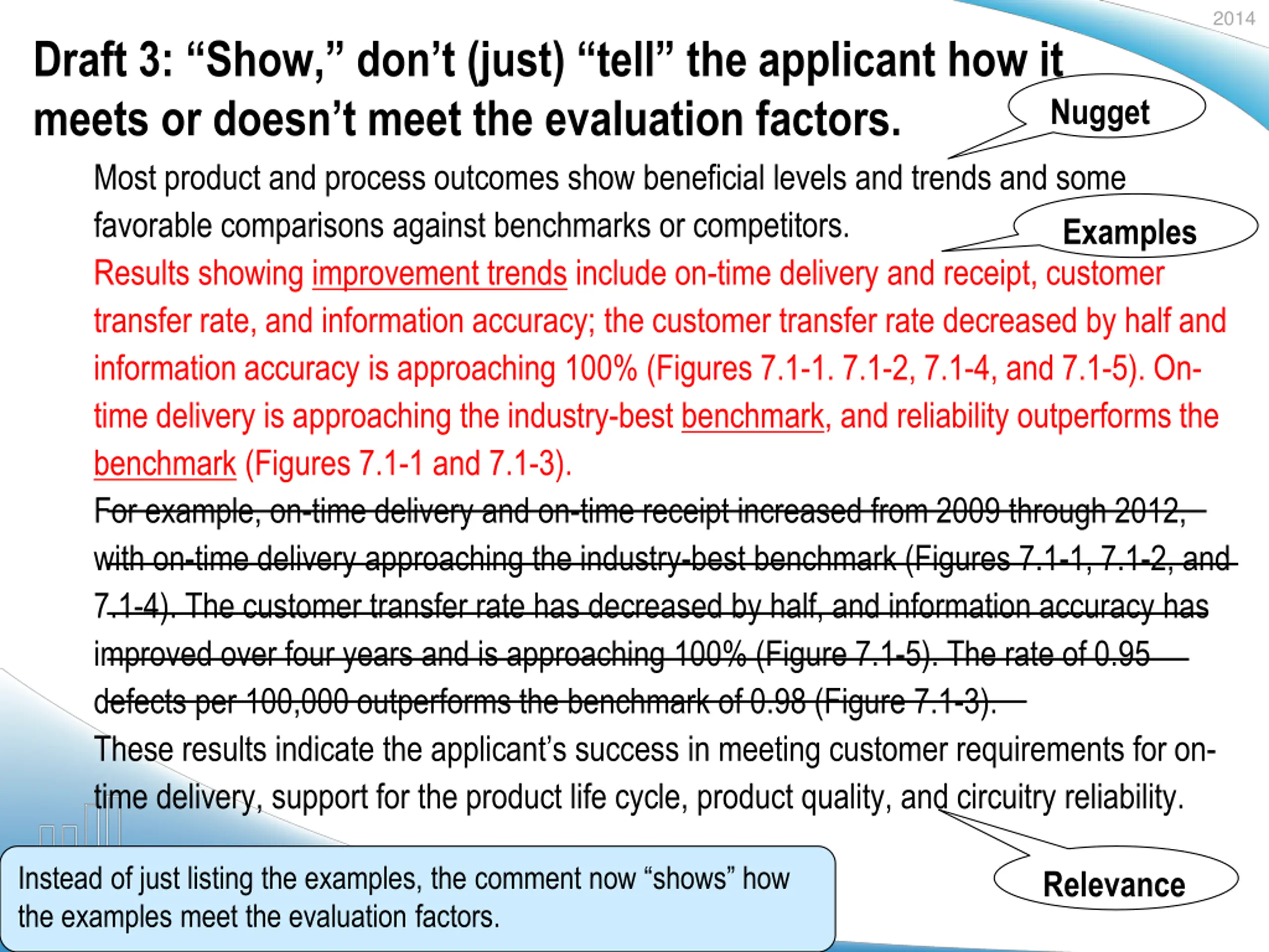 2014 Draft 3: Show, don t (just) tell the applicant how it meets or doesn t meet the evaluation factors. Most product and process outcomes show beneficial levels and trends and some favorable comparisons against benchmarks or competitors. Results showing improvement trends include on-time delivery and receipt, customer transfer rate, and information accuracy; the customer transfer rate decreased by half and information accuracy is approaching 100% (Figures 7.1-1. 7.1-2, 7.1-4, and 7.1-5). On- time delivery is approaching the industry-best benchmark, and reliability outperforms the benchmark (Figures 7.1-1 and 7.1-3). For example, on-time delivery and on-time receipt increased from 2009 through 2012, with on-time delivery approaching the industry-best benchmark (Figures 7.1-1, 7.1-2, and 7.1-4). The customer transfer rate has decreased by half, and information accuracy has improved over four years and is approaching 100% (Figure 7.1-5). The rate of 0.95 defects per 100,000 outperforms the benchmark of 0.98 (Figure 7.1-3). These results indicate the applicant s success in meeting customer requirements for on- time delivery, support for the product life cycle, product quality, and circuitry reliability. Nugget Examples Instead of just listing the examples, the comment now shows how Relevance Baldrige Performance Excellence Program | www.nist.gov/baldrige the examples meet the evaluation factors.