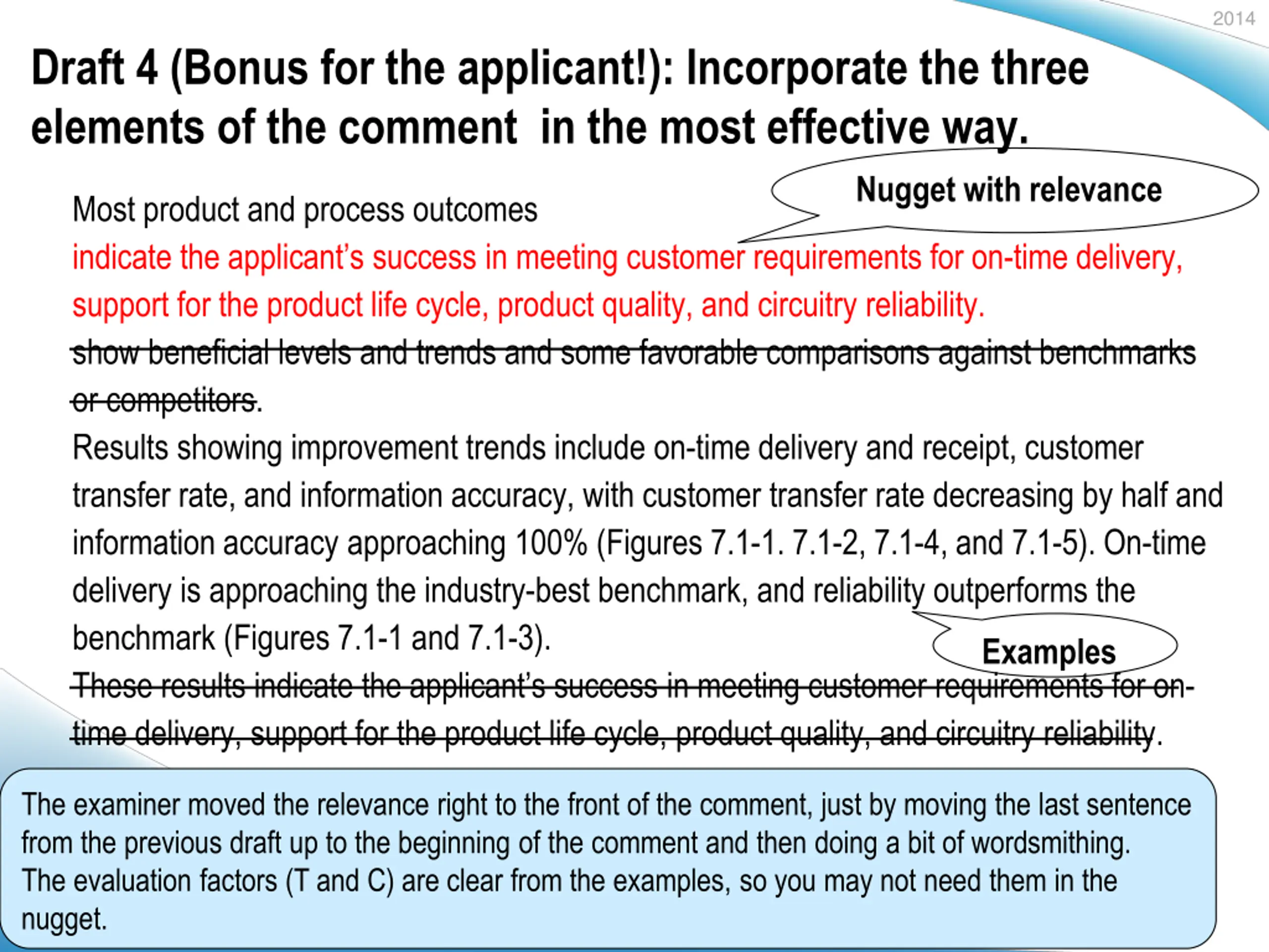2014 Draft 4 (Bonus for the applicant!): Incorporate the three elements of the comment in the most effective way. Nugget with relevance Most product and process outcomes indicate the applicant s success in meeting customer requirements for on-time delivery, support for the product life cycle, product quality, and circuitry reliability. show beneficial levels and trends and some favorable comparisons against benchmarks or competitors. Results showing improvement trends include on-time delivery and receipt, customer transfer rate, and information accuracy, with customer transfer rate decreasing by half and information accuracy approaching 100% (Figures 7.1-1. 7.1-2, 7.1-4, and 7.1-5). On-time delivery is approaching the industry-best benchmark, and reliability outperforms the benchmark (Figures 7.1-1 and 7.1-3). These results indicate the applicant s success in meeting customer requirements for on- time delivery, support for the product life cycle, product quality, and circuitry reliability. Examples The examiner moved the relevance right to the front of the comment, just by moving the last sentence from the previous draft up to the beginning of the comment and then doing a bit of wordsmithing. The evaluation factors (T and C) are clear from the examples, so you may not need them in the Baldrige Performance Excellence Program | www.nist.gov/baldrige nugget.