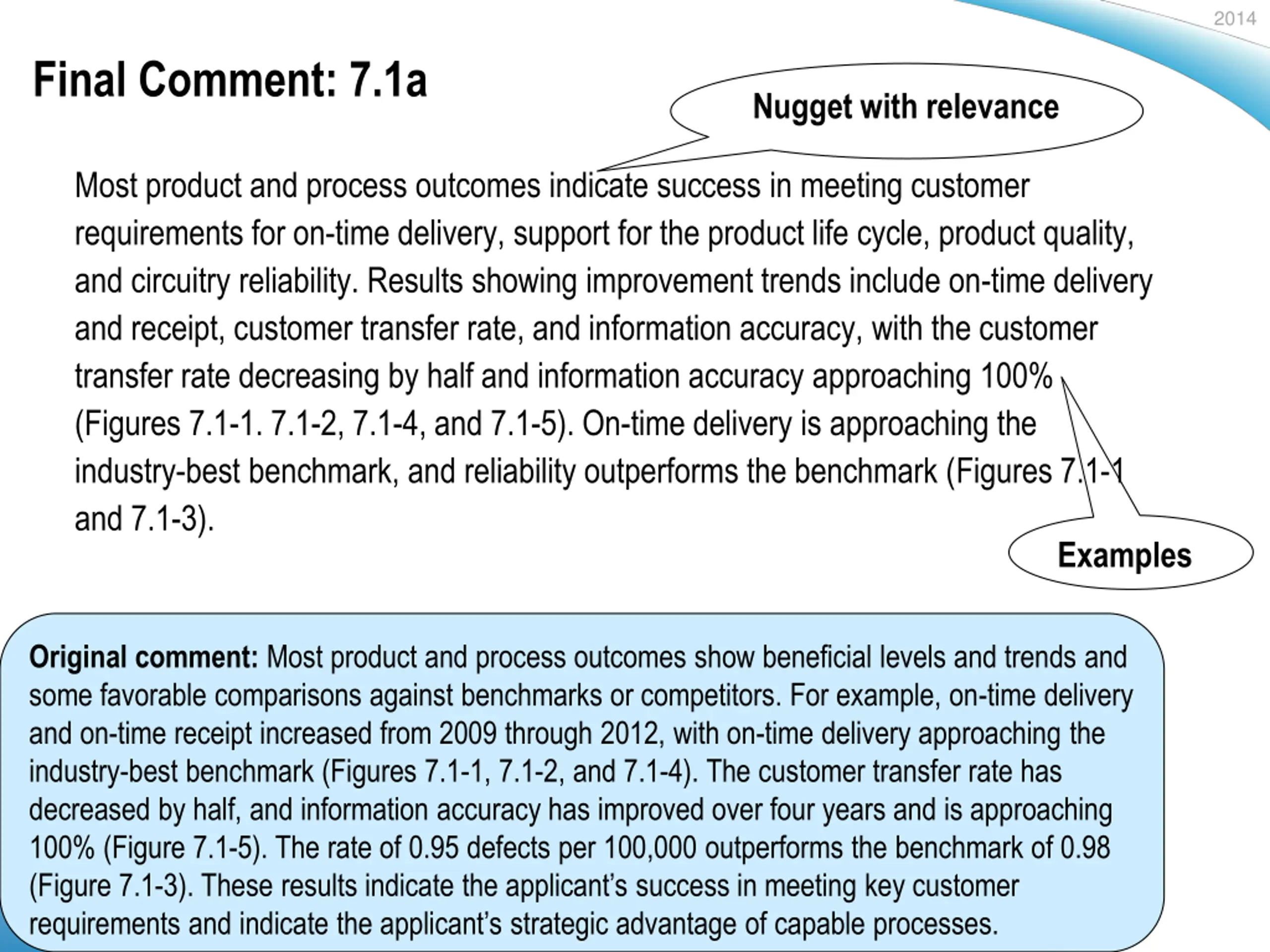 2014 Final Comment: 7.1a Nugget with relevance Most product and process outcomes indicate success in meeting customer requirements for on-time delivery, support for the product life cycle, product quality, and circuitry reliability. Results showing improvement trends include on-time delivery and receipt, customer transfer rate, and information accuracy, with the customer transfer rate decreasing by half and information accuracy approaching 100% (Figures 7.1-1. 7.1-2, 7.1-4, and 7.1-5). On-time delivery is approaching the industry-best benchmark, and reliability outperforms the benchmark (Figures 7.1-1 and 7.1-3). Examples Original comment: Most product and process outcomes show beneficial levels and trends and some favorable comparisons against benchmarks or competitors. For example, on-time delivery and on-time receipt increased from 2009 through 2012, with on-time delivery approaching the industry-best benchmark (Figures 7.1-1, 7.1-2, and 7.1-4). The customer transfer rate has decreased by half, and information accuracy has improved over four years and is approaching 100% (Figure 7.1-5). The rate of 0.95 defects per 100,000 outperforms the benchmark of 0.98 (Figure 7.1-3). These results indicate the applicant s success in meeting key customer Baldrige Performance Excellence Program | www.nist.gov/baldrige requirements and indicate the applicant s strategic advantage of capable processes.