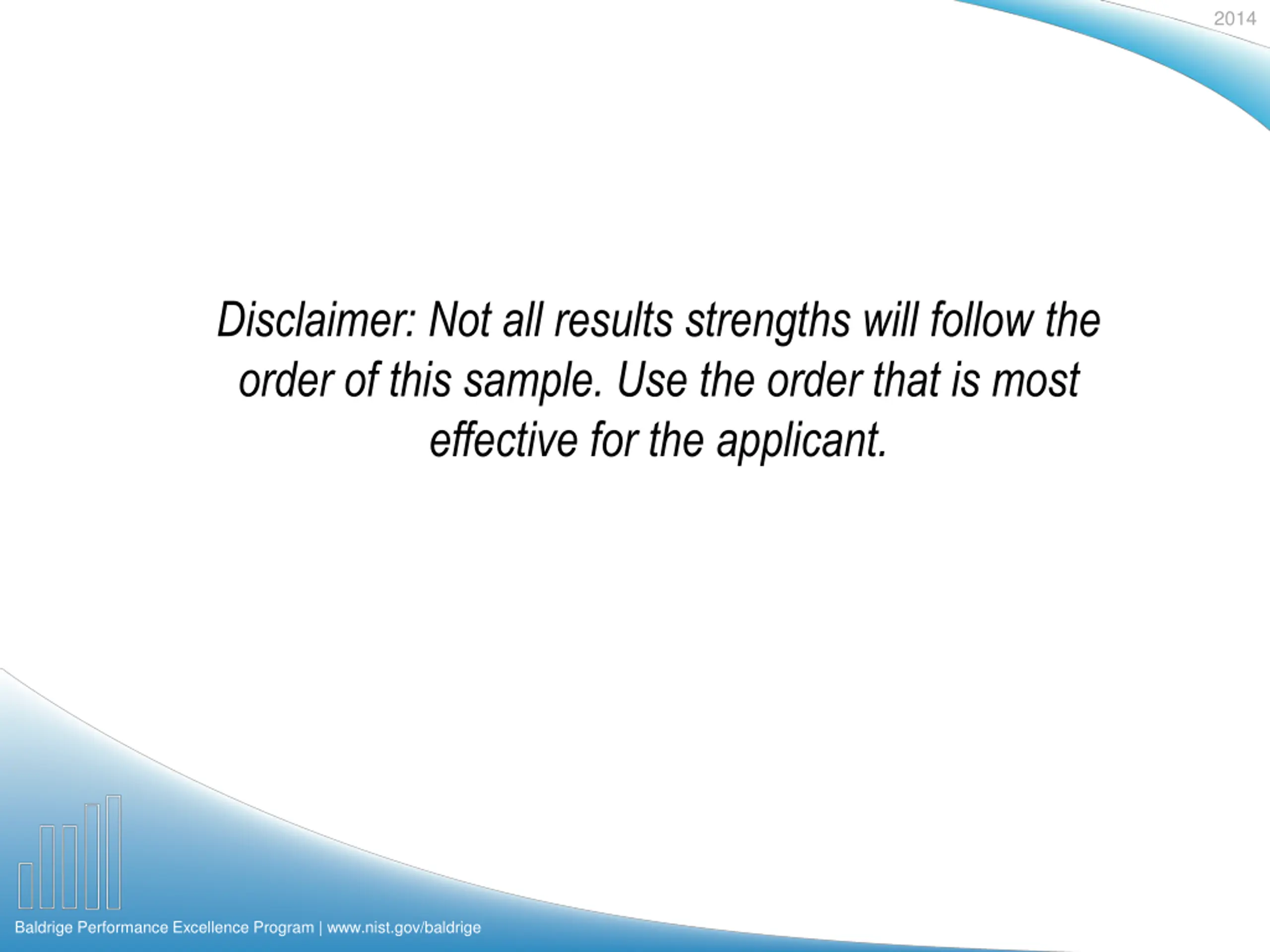 2014 Disclaimer: Not all results strengths will follow the order of this sample. Use the order that is most effective for the applicant. Baldrige Performance Excellence Program | www.nist.gov/baldrige