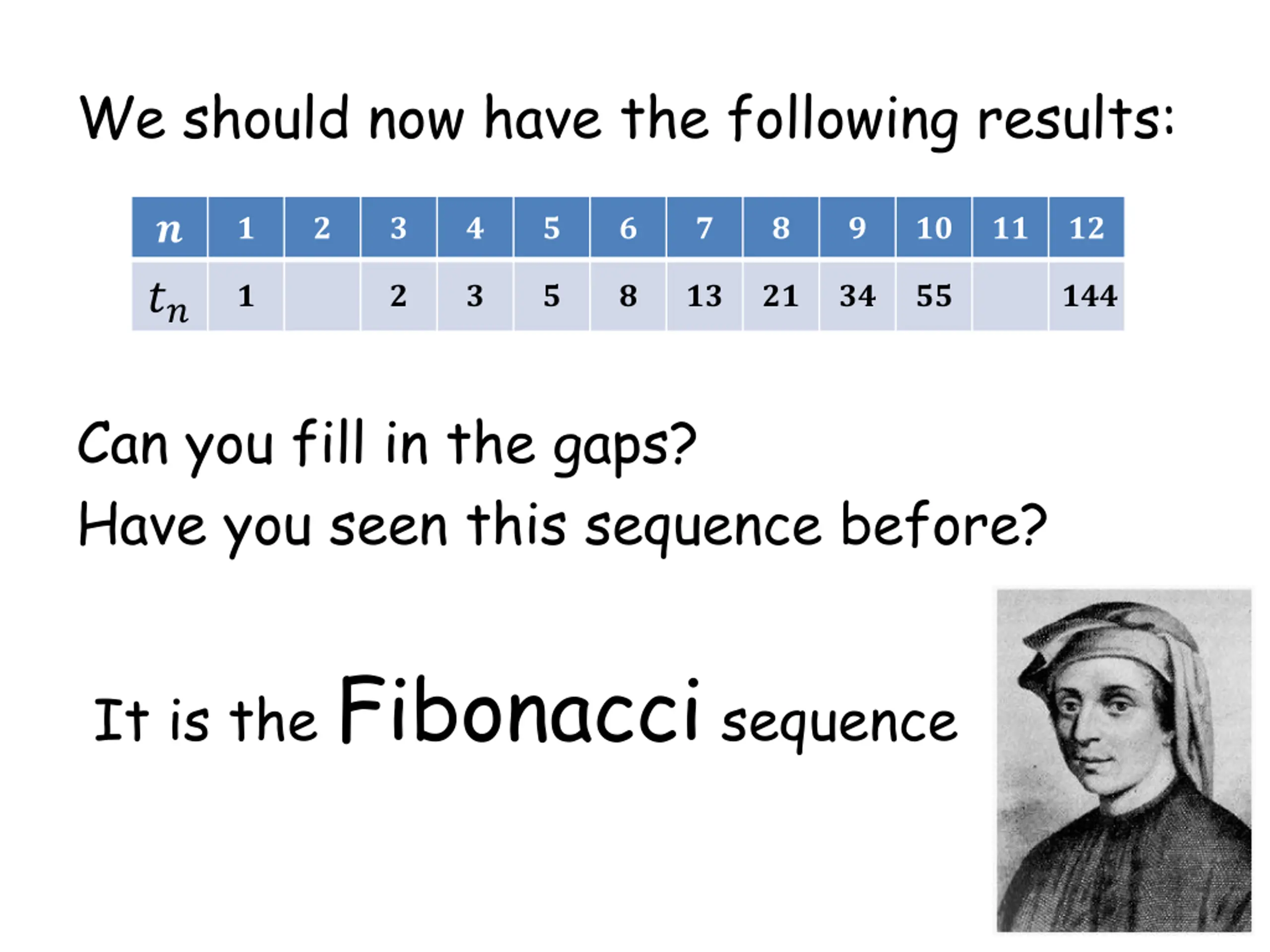 We should now have the following results: ? ?? ? ? ? ? ? ? ? ? ? ?? ?? ?? ? ? ? ? ? ?? ?? ?? ?? ??? Can you fill in the gaps? Have you seen this sequence before? It is the Fibonacci sequence