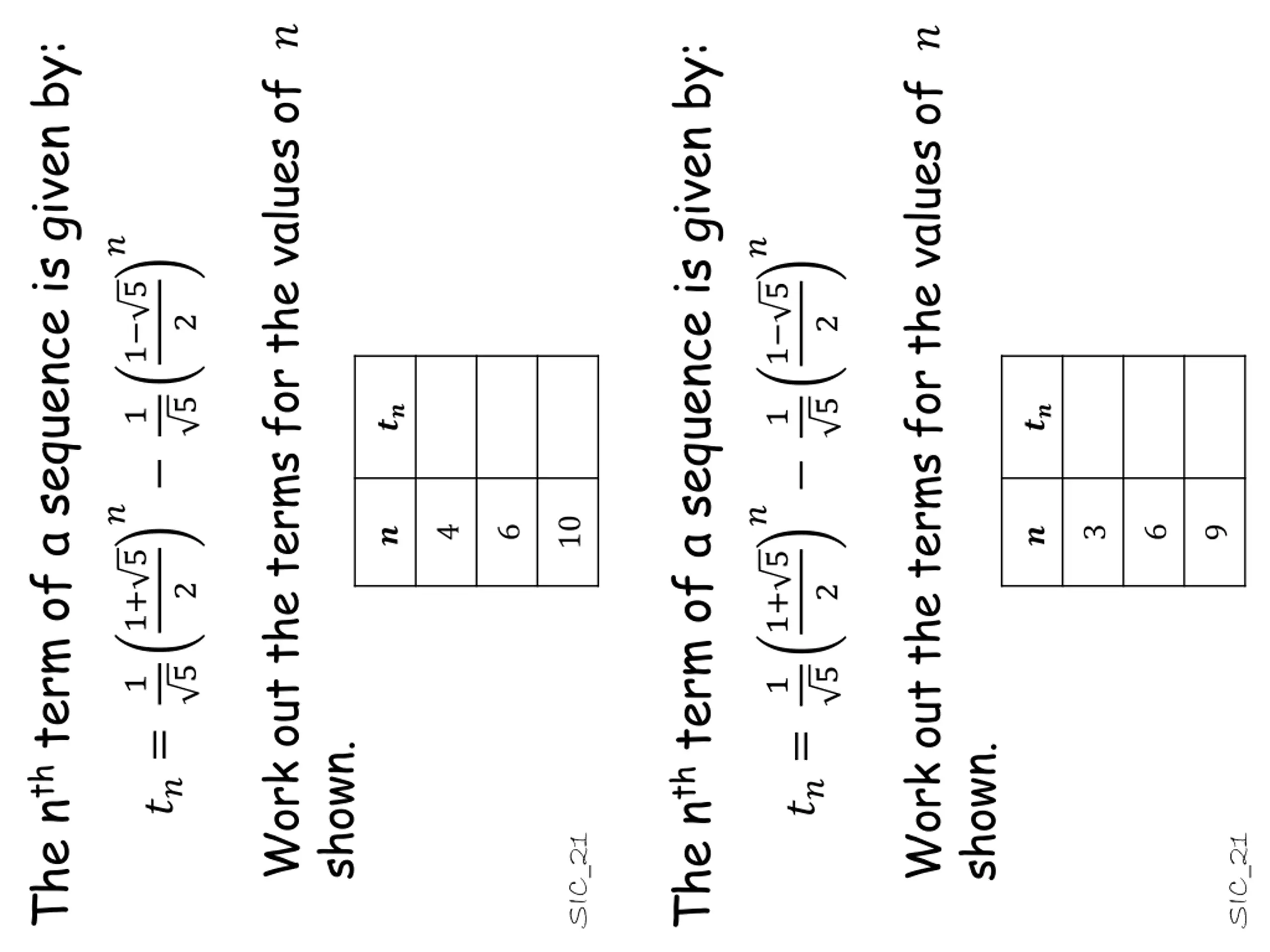 Work out the terms for the values of ? Work out the terms for the values of ? The nth term of a sequence is given by: The nth term of a sequence is given by: ? ? 1 5 1 5 2 2 5 5 ?? ?? 1 1 ? ? 10 9 4 6 3 6 ? ? 1+ 5 1+ 5 2 2 5 5 1 1 ??= ??= shown. shown. SIC_21 SIC_21