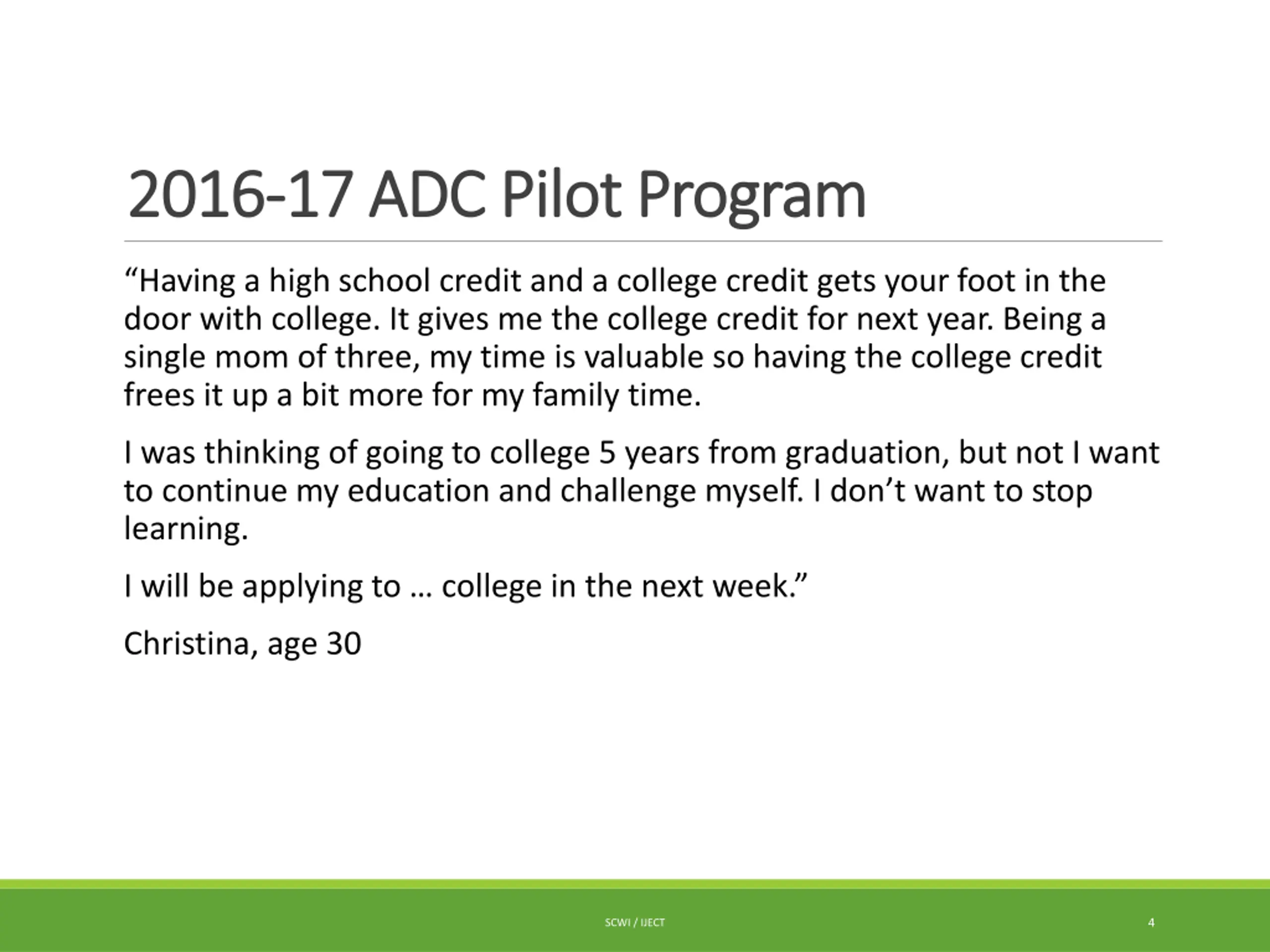2016 2016- -17 ADC Pilot Program 17 ADC Pilot Program Having a high school credit and a college credit gets your foot in the door with college. It gives me the college credit for next year. Being a single mom of three, my time is valuable so having the college credit frees it up a bit more for my family time. I was thinking of going to college 5 years from graduation, but not I want to continue my education and challenge myself. I don t want to stop learning. I will be applying to college in the next week. Christina, age 30 4 SCWI / IJECT