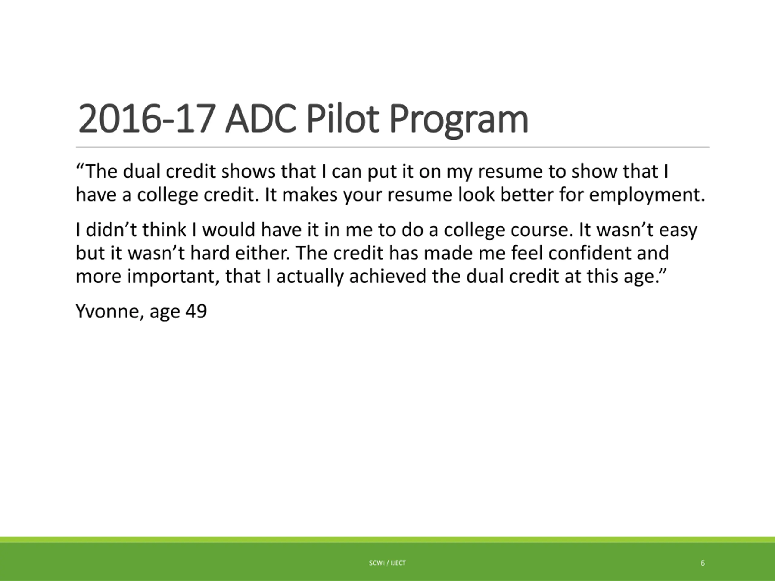 2016 2016- -17 ADC Pilot Program 17 ADC Pilot Program The dual credit shows that I can put it on my resume to show that I have a college credit. It makes your resume look better for employment. I didn t think I would have it in me to do a college course. It wasn t easy but it wasn t hard either. The credit has made me feel confident and more important, that I actually achieved the dual credit at this age. Yvonne, age 49 6 SCWI / IJECT
