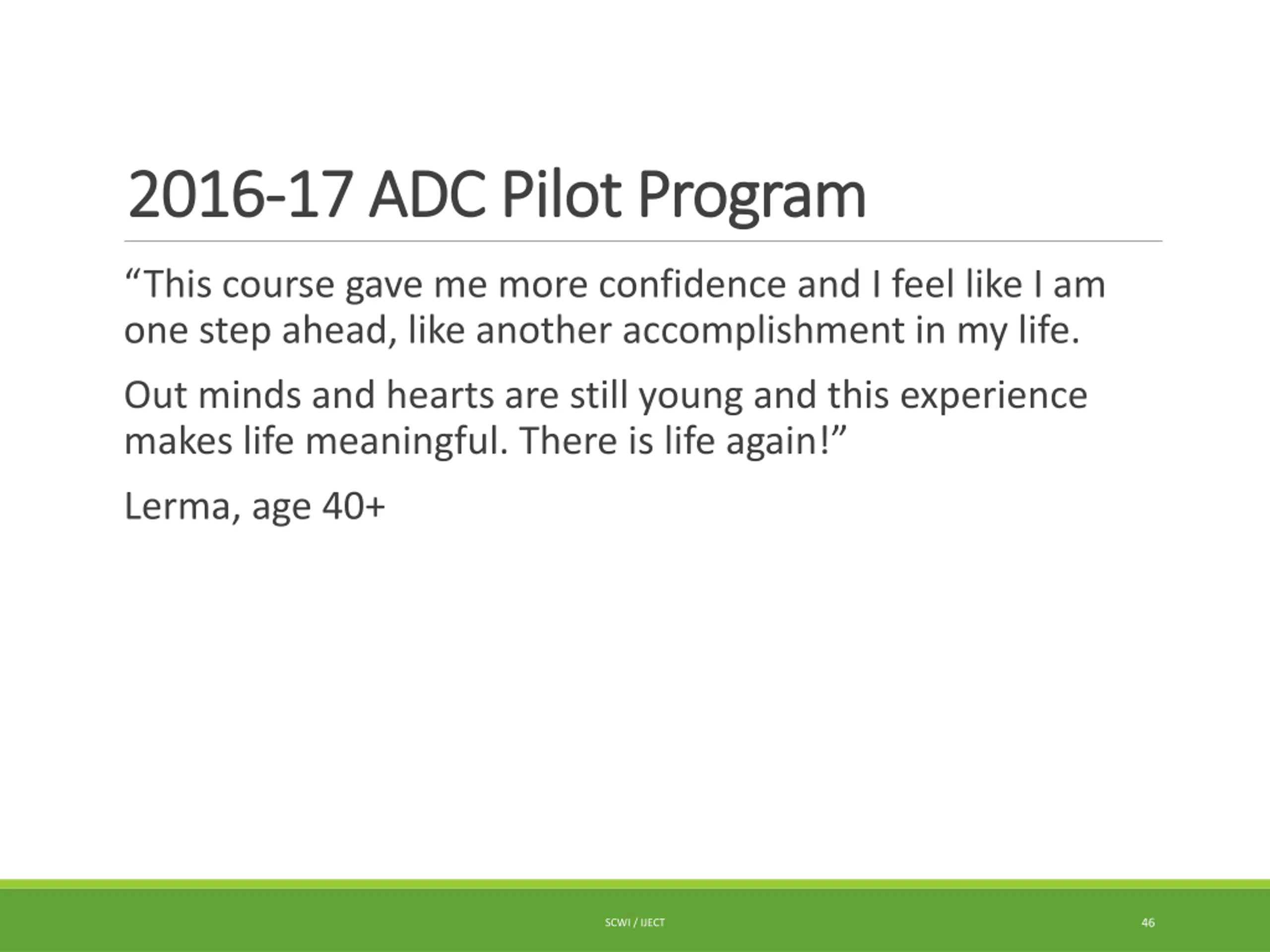 2016 2016- -17 ADC Pilot Program 17 ADC Pilot Program This course gave me more confidence and I feel like I am one step ahead, like another accomplishment in my life. Out minds and hearts are still young and this experience makes life meaningful. There is life again! Lerma, age 40+ 46 SCWI / IJECT