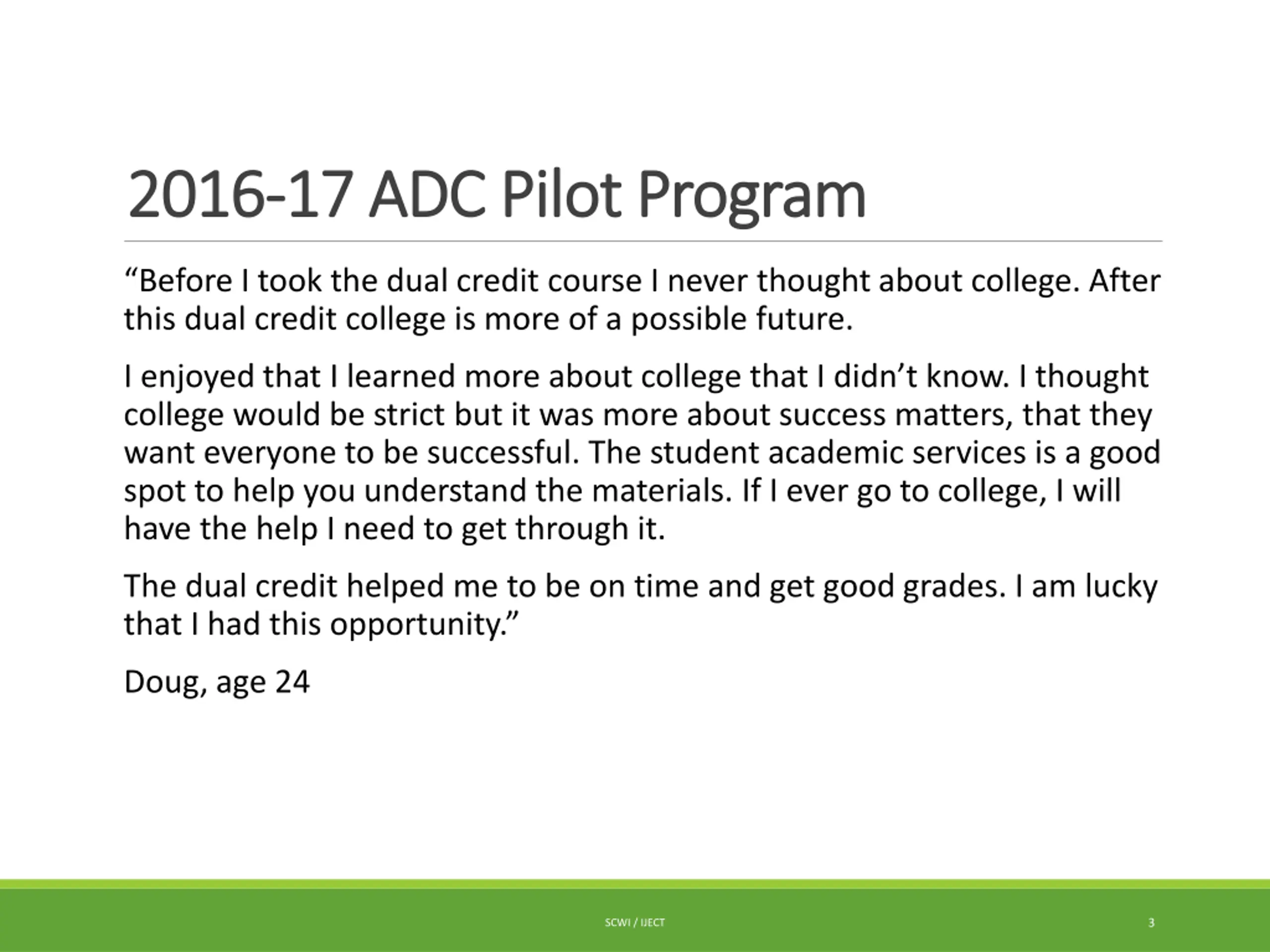 2016 2016- -17 ADC Pilot Program 17 ADC Pilot Program Before I took the dual credit course I never thought about college. After this dual credit college is more of a possible future. I enjoyed that I learned more about college that I didn t know. I thought college would be strict but it was more about success matters, that they want everyone to be successful. The student academic services is a good spot to help you understand the materials. If I ever go to college, I will have the help I need to get through it. The dual credit helped me to be on time and get good grades. I am lucky that I had this opportunity. Doug, age 24 3 SCWI / IJECT