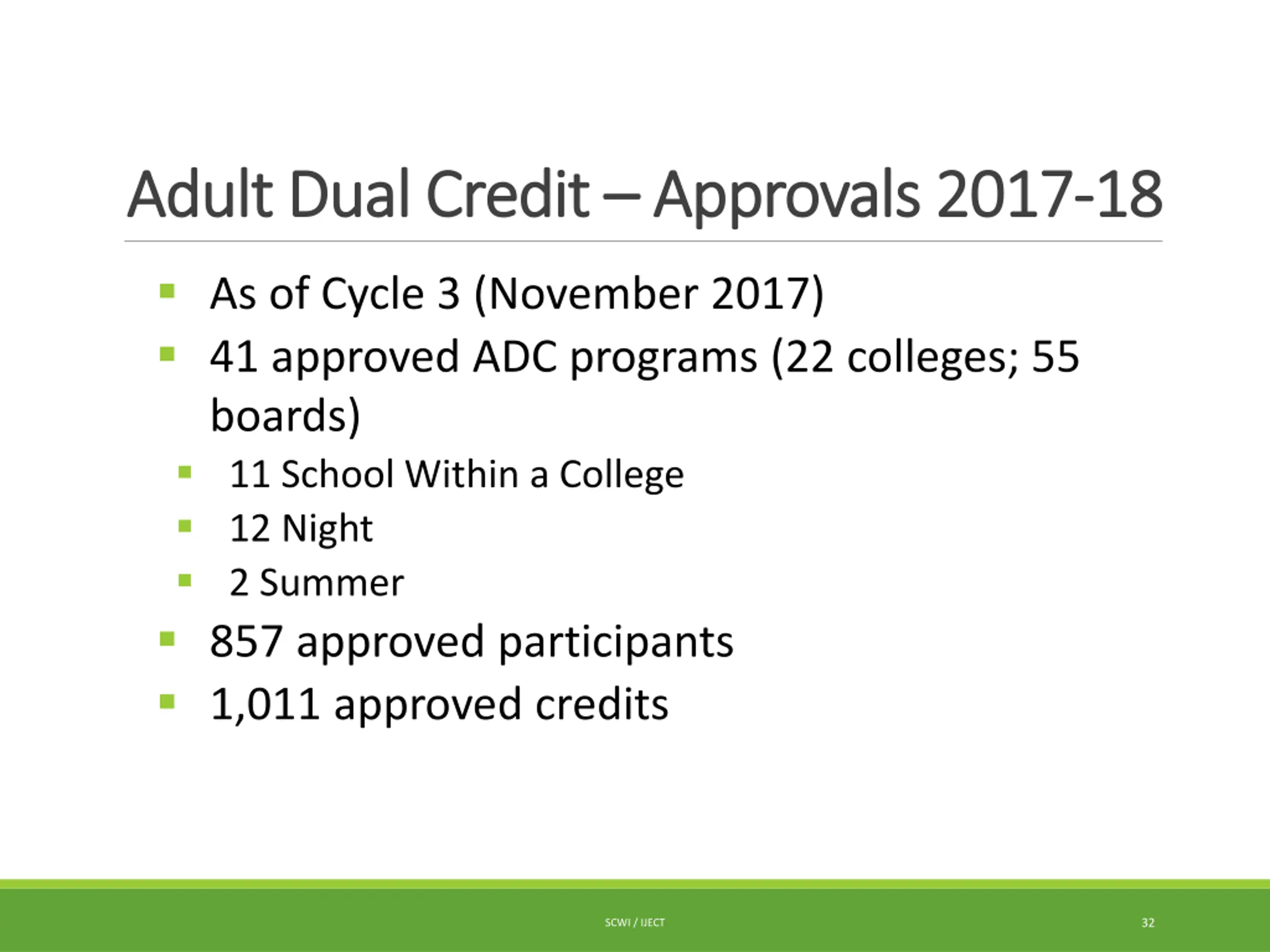 Adult Dual Credit Adult Dual Credit Approvals 2017 Approvals 2017- -18 18 As of Cycle 3 (November 2017) 41 approved ADC programs (22 colleges; 55 boards) 11 School Within a College 12 Night 2 Summer 857 approved participants 1,011 approved credits 32 SCWI / IJECT