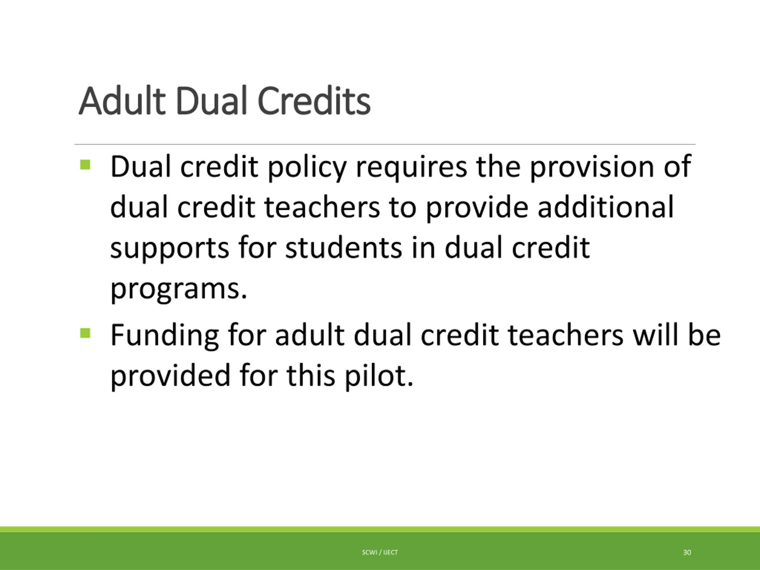 Adult Dual Credits Adult Dual Credits Dual credit policy requires the provision of dual credit teachers to provide additional supports for students in dual credit programs. Funding for adult dual credit teachers will be provided for this pilot. 30 SCWI / IJECT