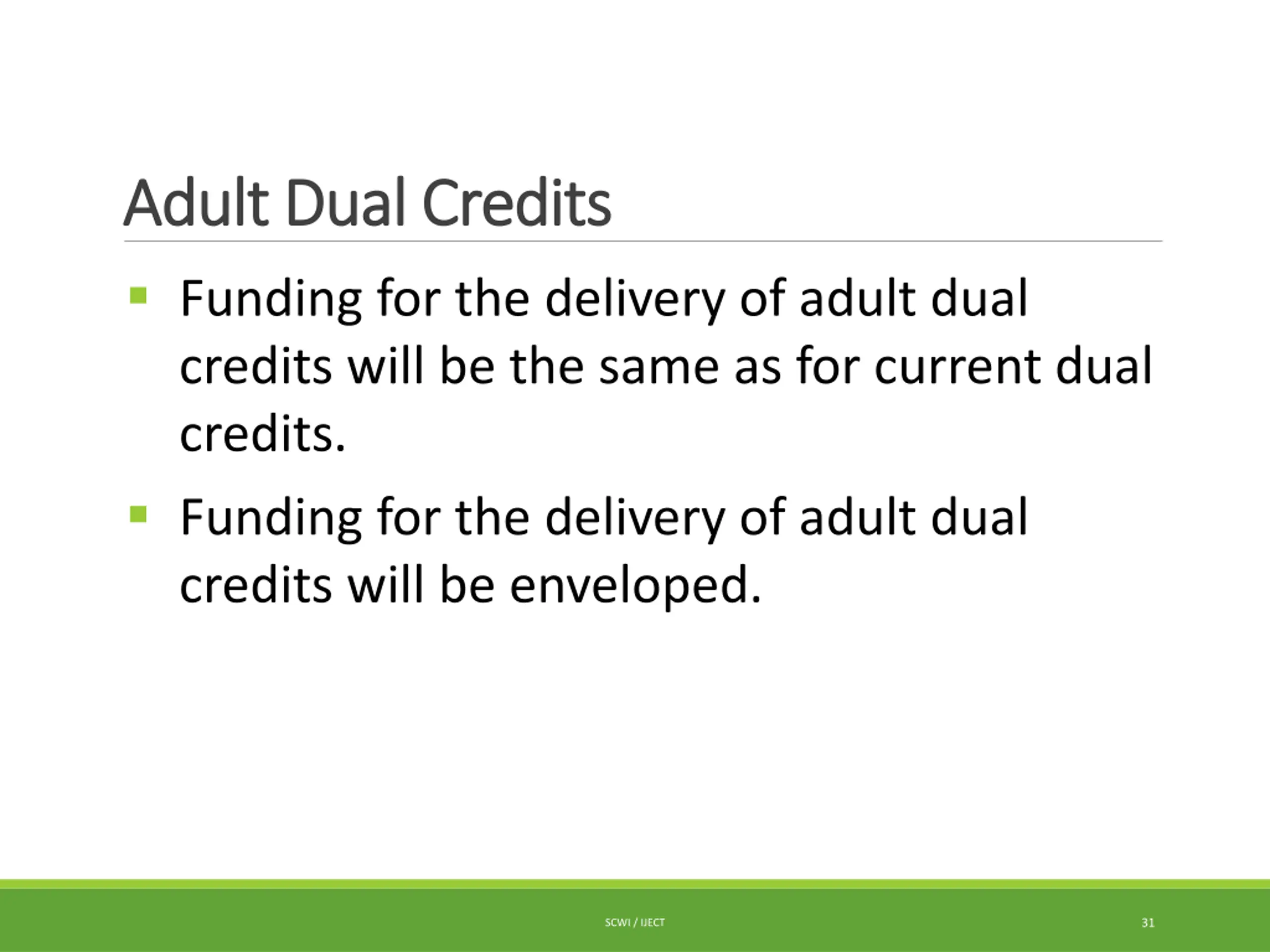 Adult Dual Credits Adult Dual Credits Funding for the delivery of adult dual credits will be the same as for current dual credits. Funding for the delivery of adult dual credits will be enveloped. 31 SCWI / IJECT