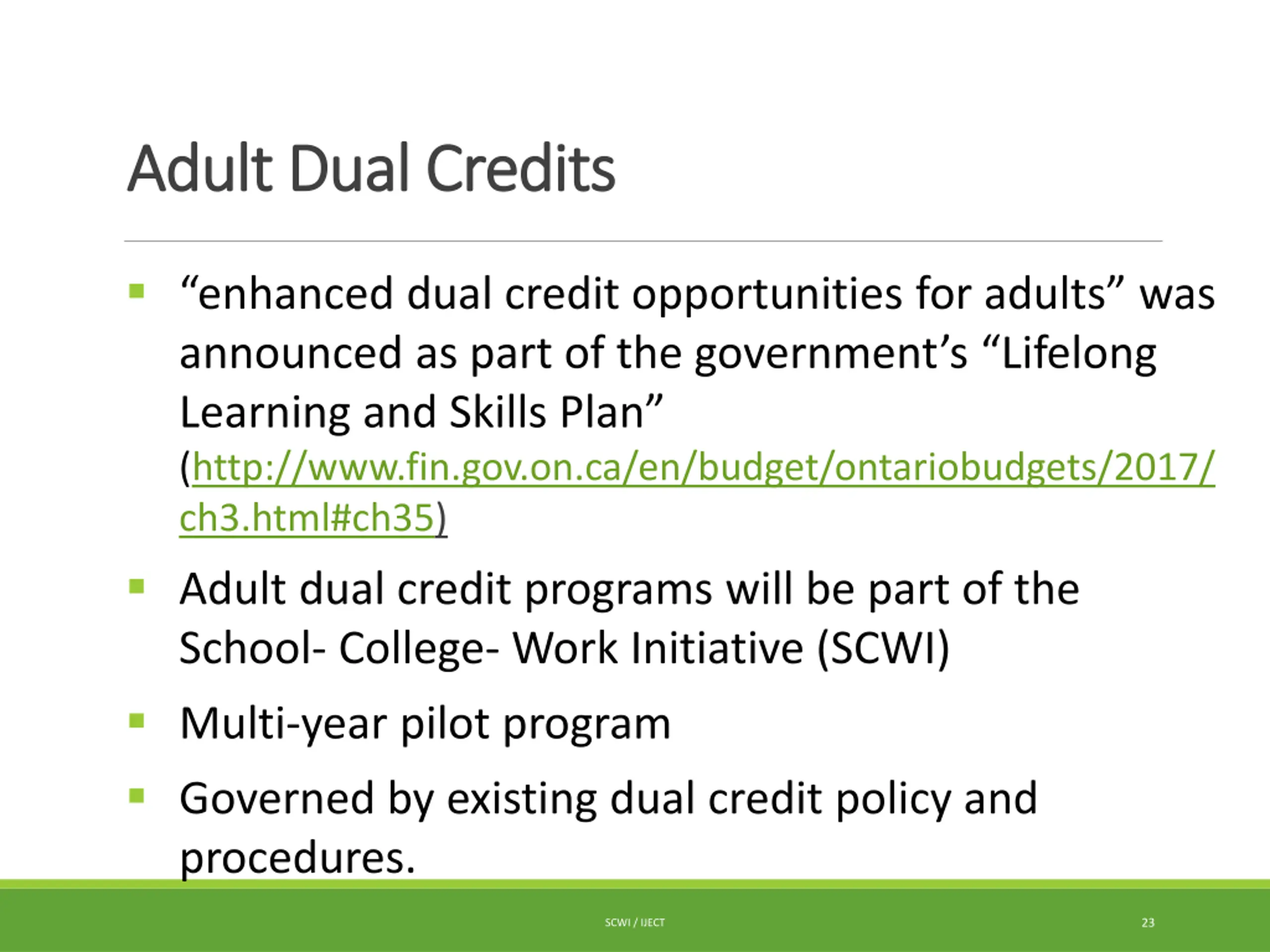 Adult Dual Credits Adult Dual Credits enhanced dual credit opportunities for adults was announced as part of the government s Lifelong Learning and Skills Plan (http://www.fin.gov.on.ca/en/budget/ontariobudgets/2017/ ch3.html#ch35) Adult dual credit programs will be part of the School- College- Work Initiative (SCWI) Multi-year pilot program Governed by existing dual credit policy and procedures. 23 SCWI / IJECT