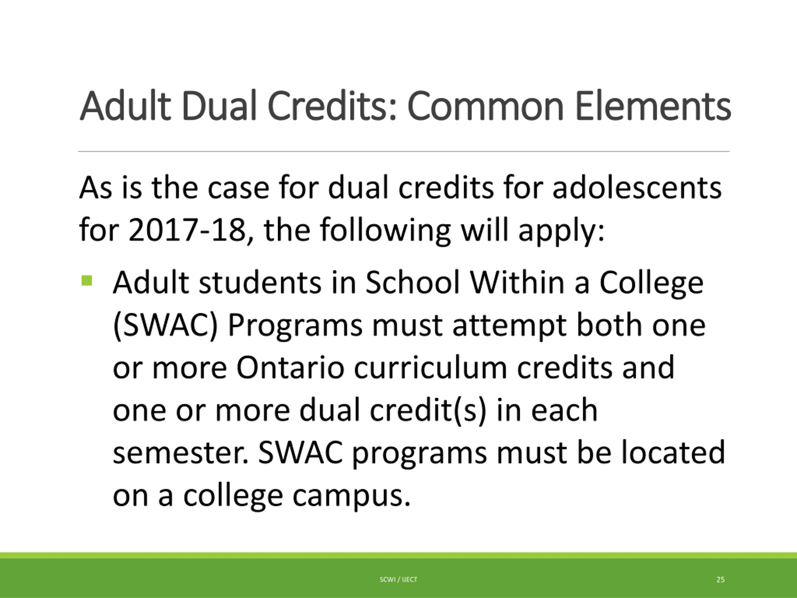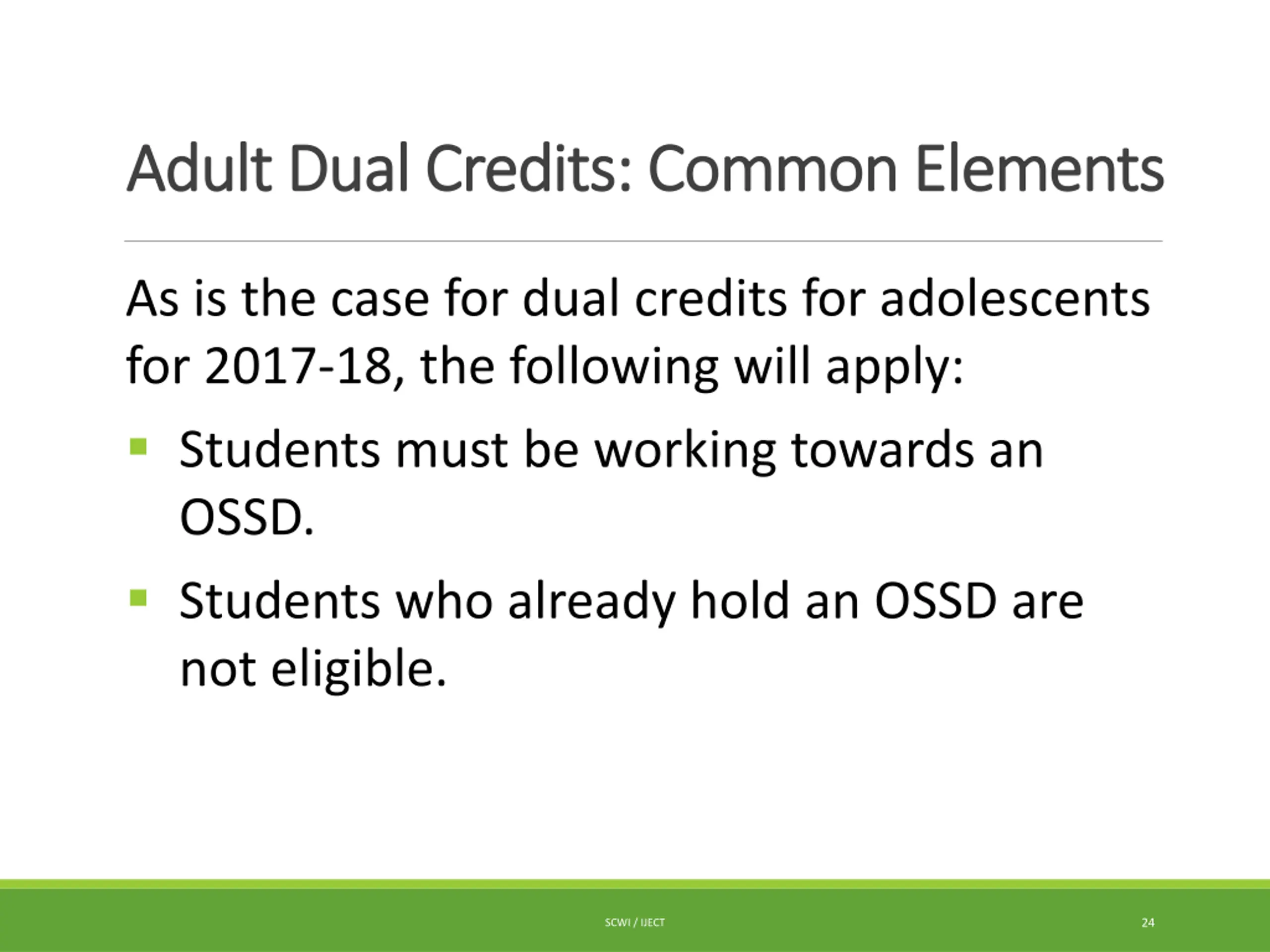 Adult Dual Credits: Common Elements Adult Dual Credits: Common Elements As is the case for dual credits for adolescents for 2017-18, the following will apply: Students must be working towards an OSSD. Students who already hold an OSSD are not eligible. 24 SCWI / IJECT