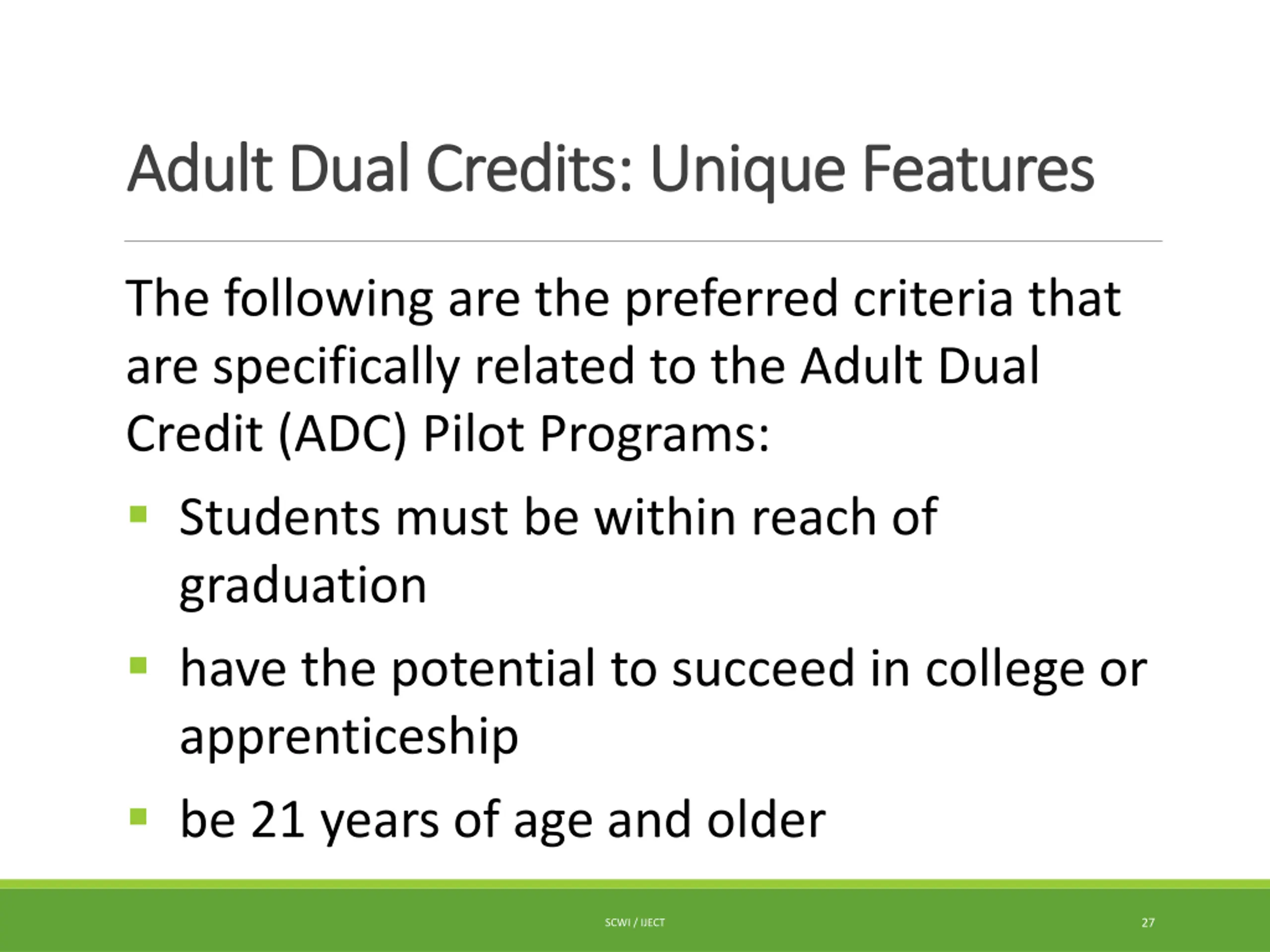 Adult Dual Credits: Unique Features Adult Dual Credits: Unique Features The following are the preferred criteria that are specifically related to the Adult Dual Credit (ADC) Pilot Programs: Students must be within reach of graduation have the potential to succeed in college or apprenticeship be 21 years of age and older 27 SCWI / IJECT
