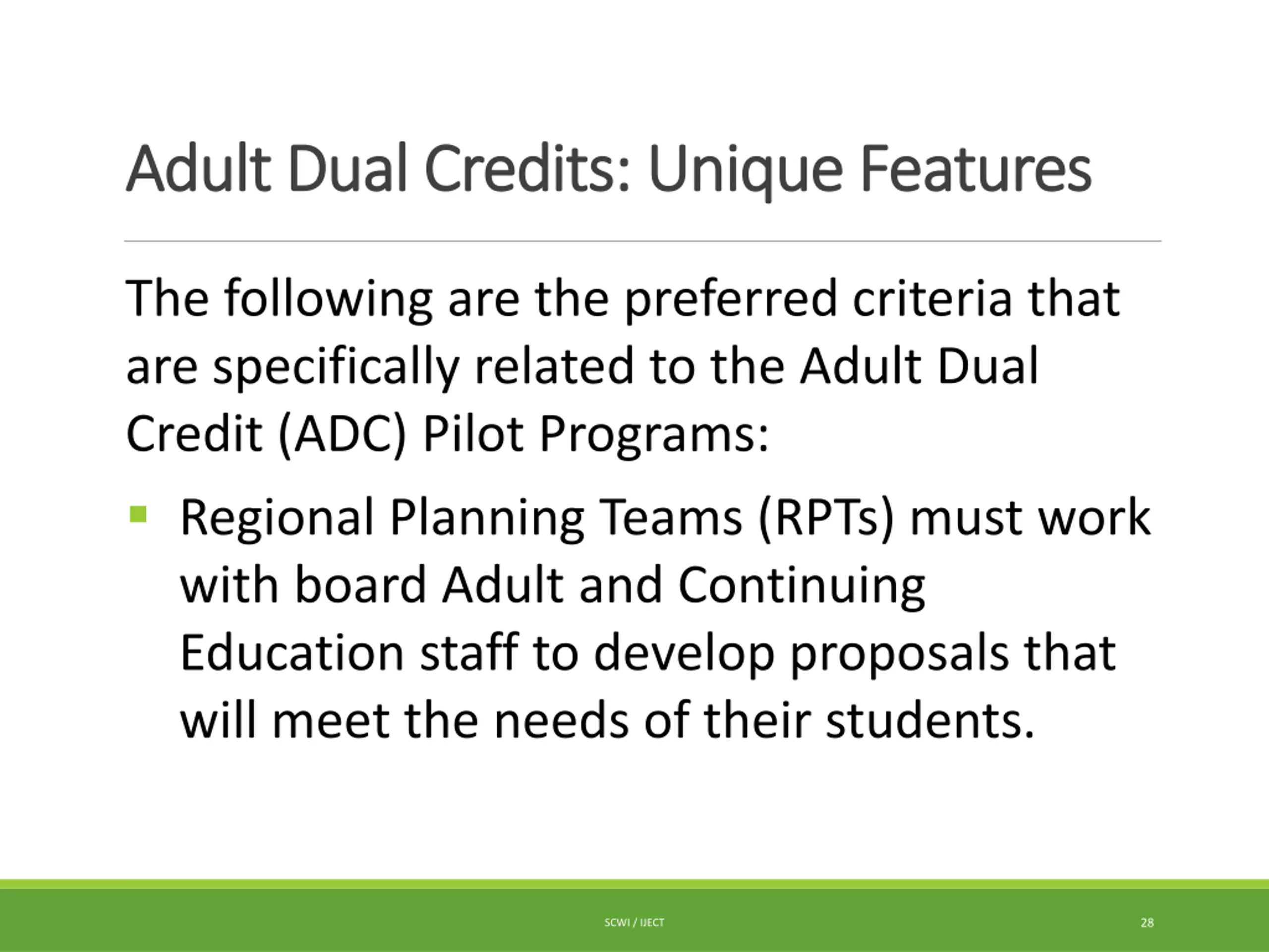 Adult Dual Credits: Unique Features Adult Dual Credits: Unique Features The following are the preferred criteria that are specifically related to the Adult Dual Credit (ADC) Pilot Programs: Regional Planning Teams (RPTs) must work with board Adult and Continuing Education staff to develop proposals that will meet the needs of their students. 28 SCWI / IJECT
