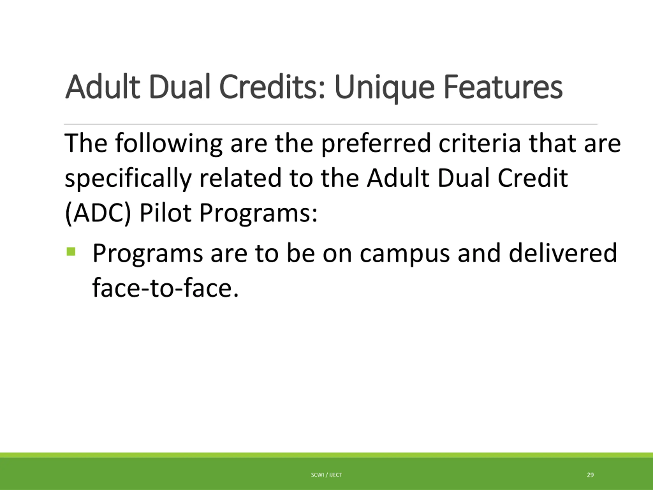 Adult Dual Credits: Unique Features Adult Dual Credits: Unique Features The following are the preferred criteria that are specifically related to the Adult Dual Credit (ADC) Pilot Programs: Programs are to be on campus and delivered face-to-face. 29 SCWI / IJECT