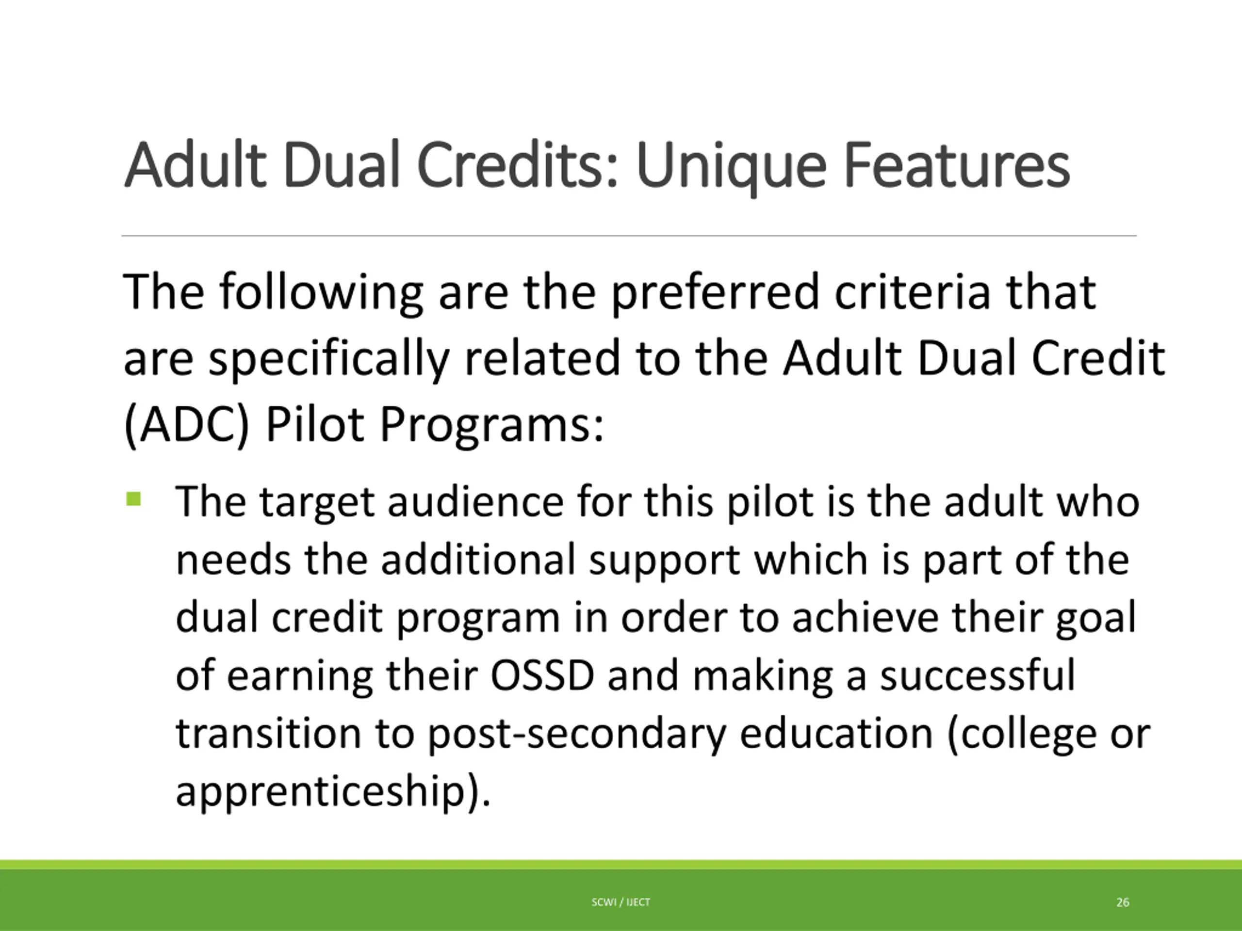 Adult Dual Credits: Unique Features Adult Dual Credits: Unique Features The following are the preferred criteria that are specifically related to the Adult Dual Credit (ADC) Pilot Programs: The target audience for this pilot is the adult who needs the additional support which is part of the dual credit program in order to achieve their goal of earning their OSSD and making a successful transition to post-secondary education (college or apprenticeship). 26 SCWI / IJECT