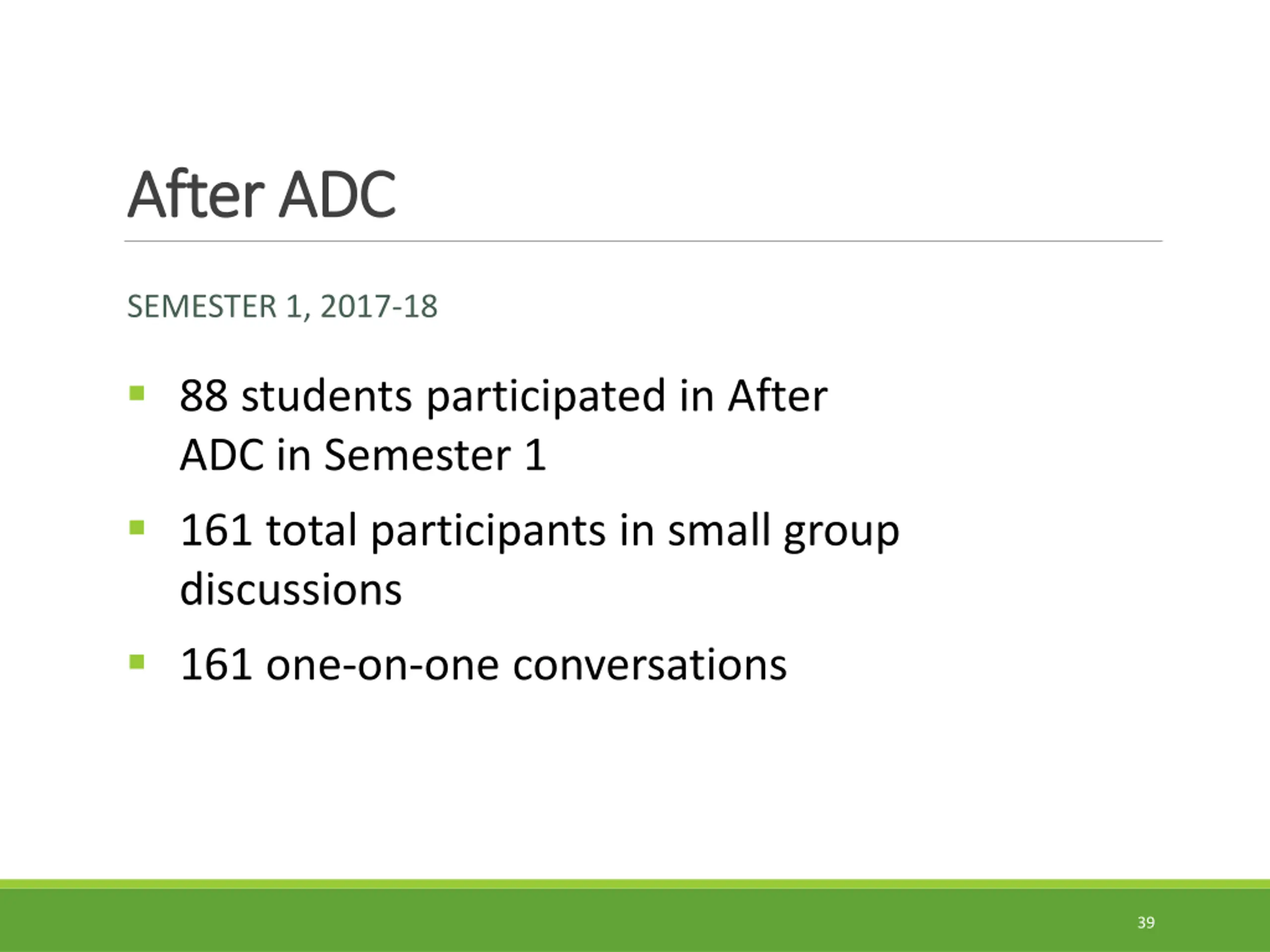 After ADC After ADC SEMESTER 1, 2017-18 88 students participated in After ADC in Semester 1 161 total participants in small group discussions 161 one-on-one conversations 39