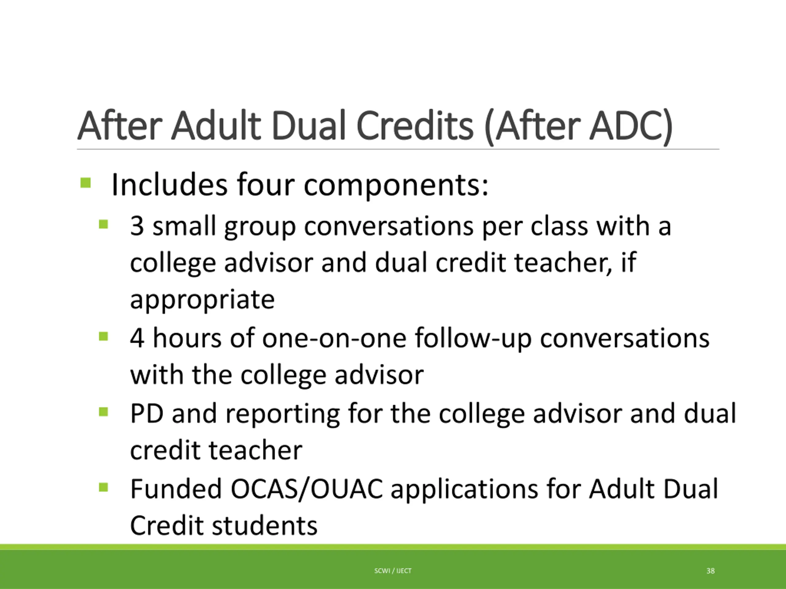 After Adult Dual Credits (After ADC) After Adult Dual Credits (After ADC) Includes four components: 3 small group conversations per class with a college advisor and dual credit teacher, if appropriate 4 hours of one-on-one follow-up conversations with the college advisor PD and reporting for the college advisor and dual credit teacher Funded OCAS/OUAC applications for Adult Dual Credit students 38 SCWI / IJECT