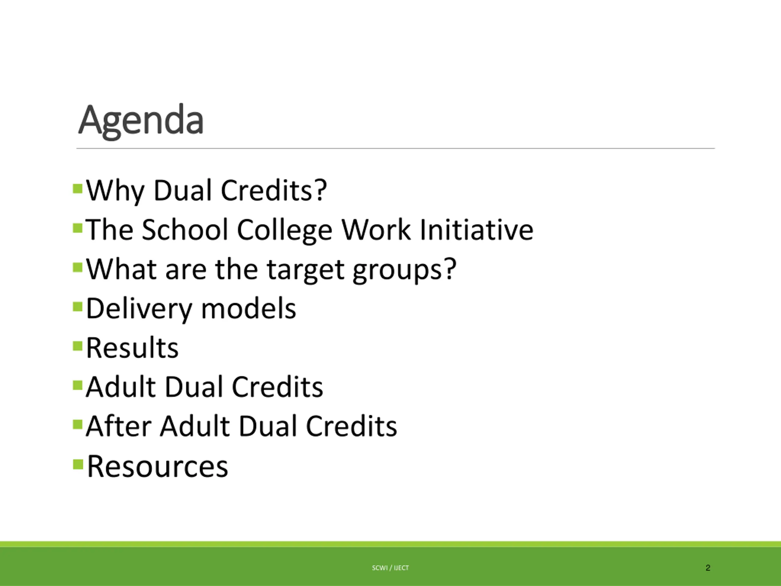 Agenda Agenda Why Dual Credits? The School College Work Initiative What are the target groups? Delivery models Results Adult Dual Credits After Adult Dual Credits Resources 2 SCWI / IJECT