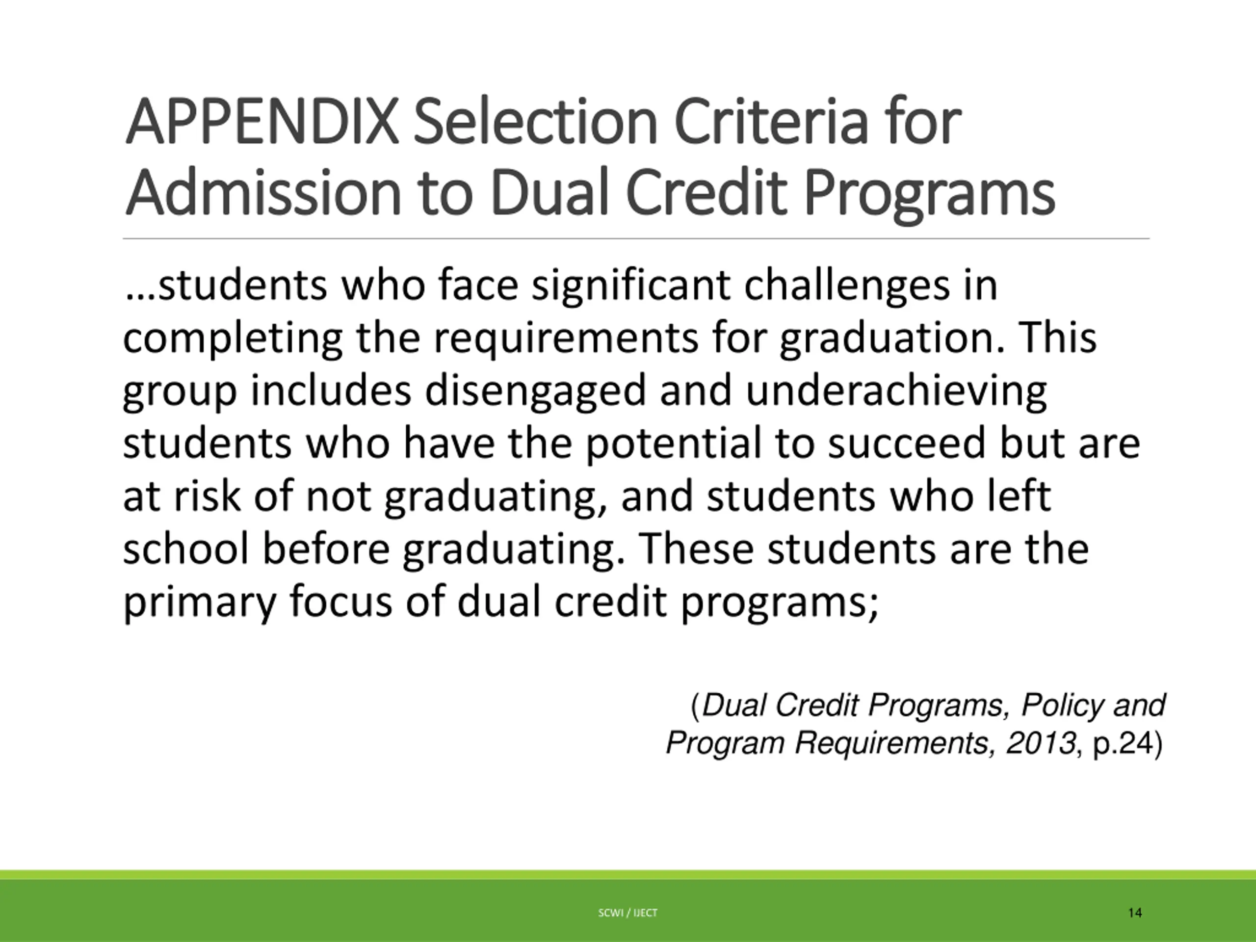 APPENDIX Selection Criteria for APPENDIX Selection Criteria for Admission to Dual Credit Programs Admission to Dual Credit Programs students who face significant challenges in completing the requirements for graduation. This group includes disengaged and underachieving students who have the potential to succeed but are at risk of not graduating, and students who left school before graduating. These students are the primary focus of dual credit programs; (Dual Credit Programs, Policy and Program Requirements, 2013, p.24) 14 SCWI / IJECT