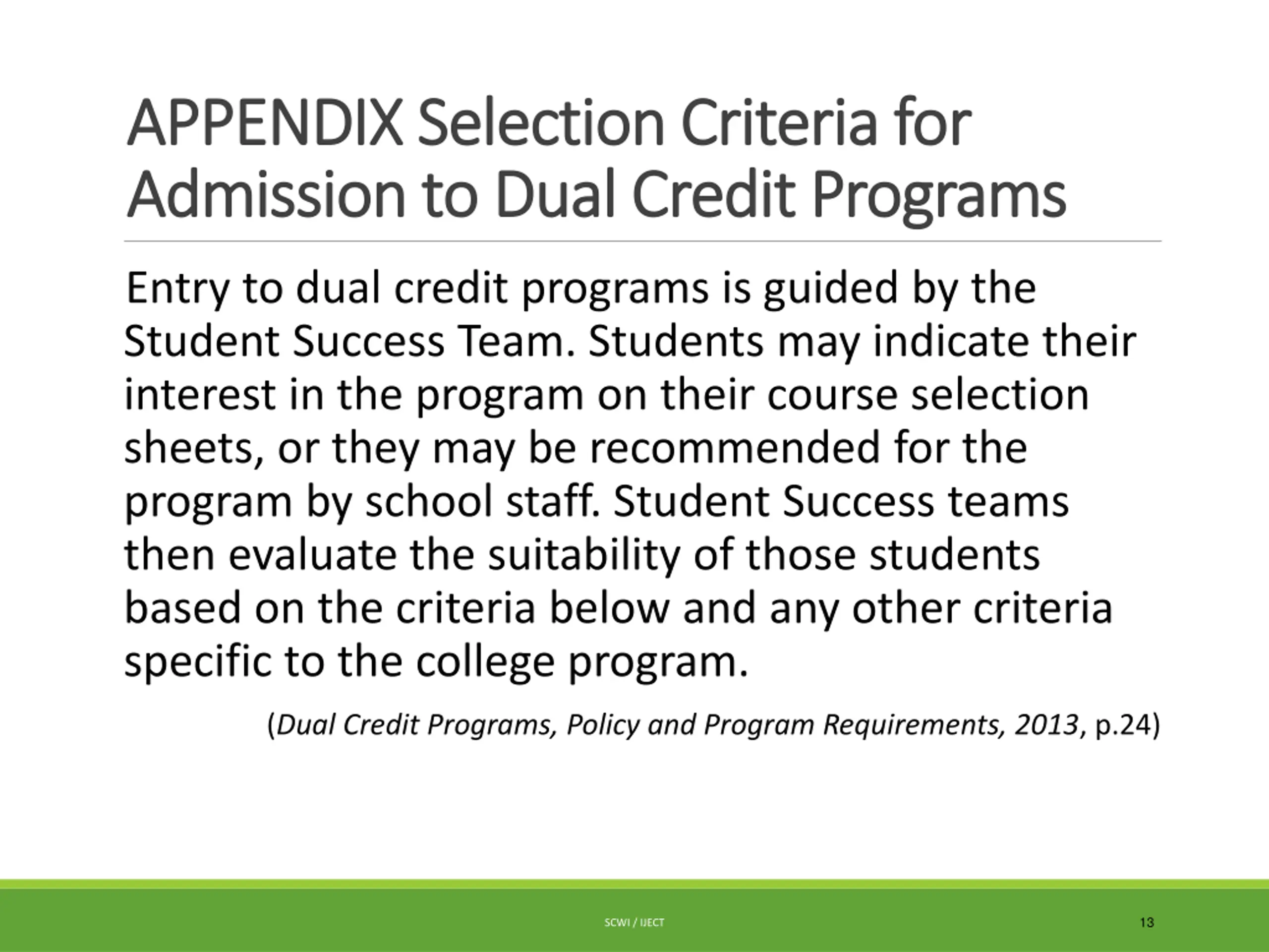 APPENDIX Selection Criteria for APPENDIX Selection Criteria for Admission to Dual Credit Programs Admission to Dual Credit Programs Entry to dual credit programs is guided by the Student Success Team. Students may indicate their interest in the program on their course selection sheets, or they may be recommended for the program by school staff. Student Success teams then evaluate the suitability of those students based on the criteria below and any other criteria specific to the college program. (Dual Credit Programs, Policy and Program Requirements, 2013, p.24) 13 SCWI / IJECT