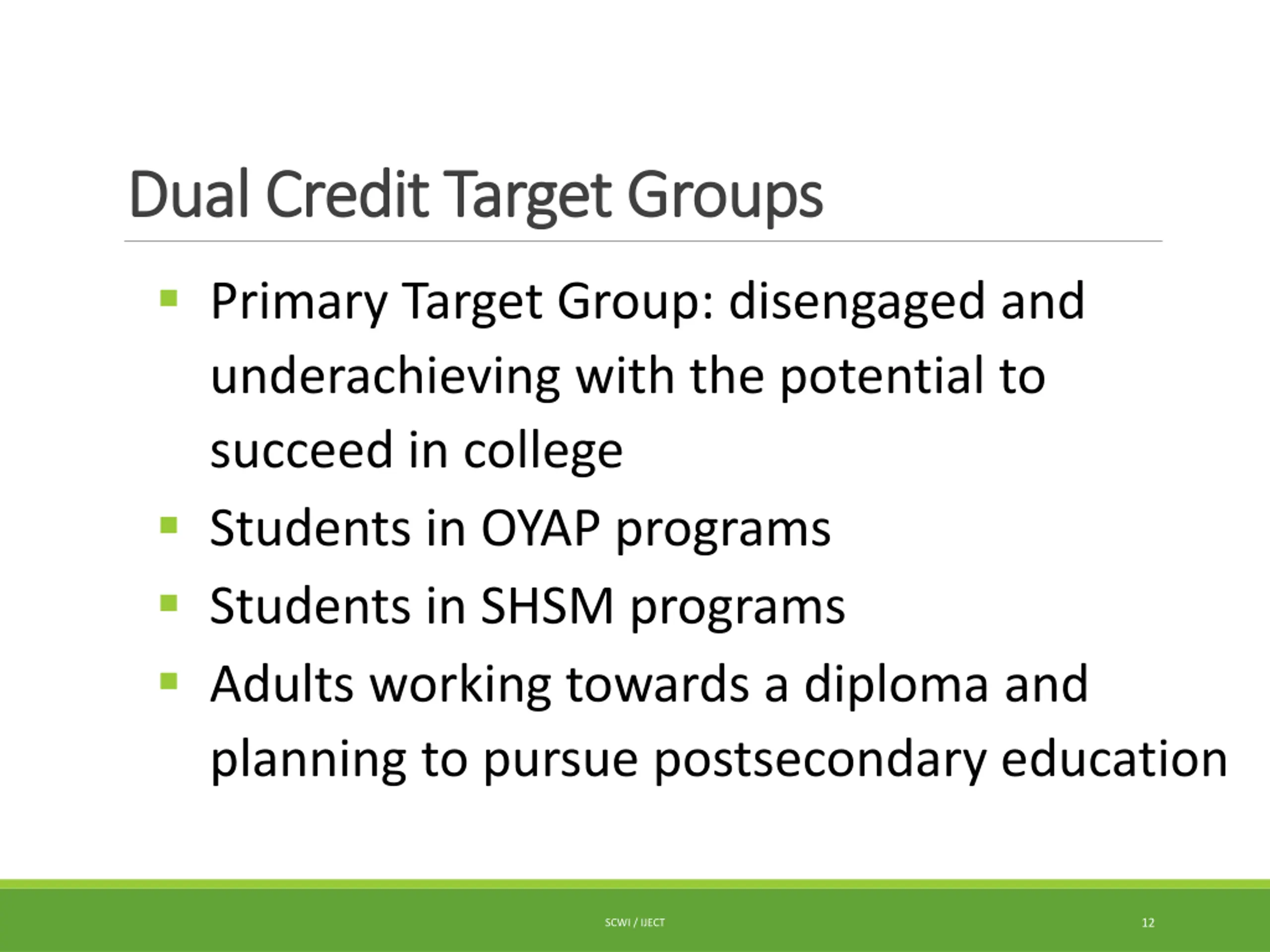 Dual Credit Target Dual Credit Target Groups Groups Primary Target Group: disengaged and underachieving with the potential to succeed in college Students in OYAP programs Students in SHSM programs Adults working towards a diploma and planning to pursue postsecondary education 12 SCWI / IJECT