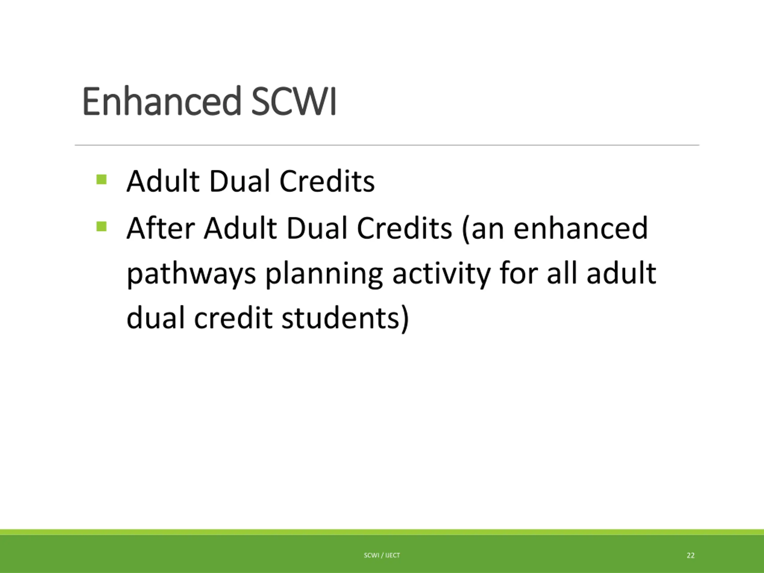 Enhanced SCWI Enhanced SCWI Adult Dual Credits After Adult Dual Credits (an enhanced pathways planning activity for all adult dual credit students) 22 SCWI / IJECT