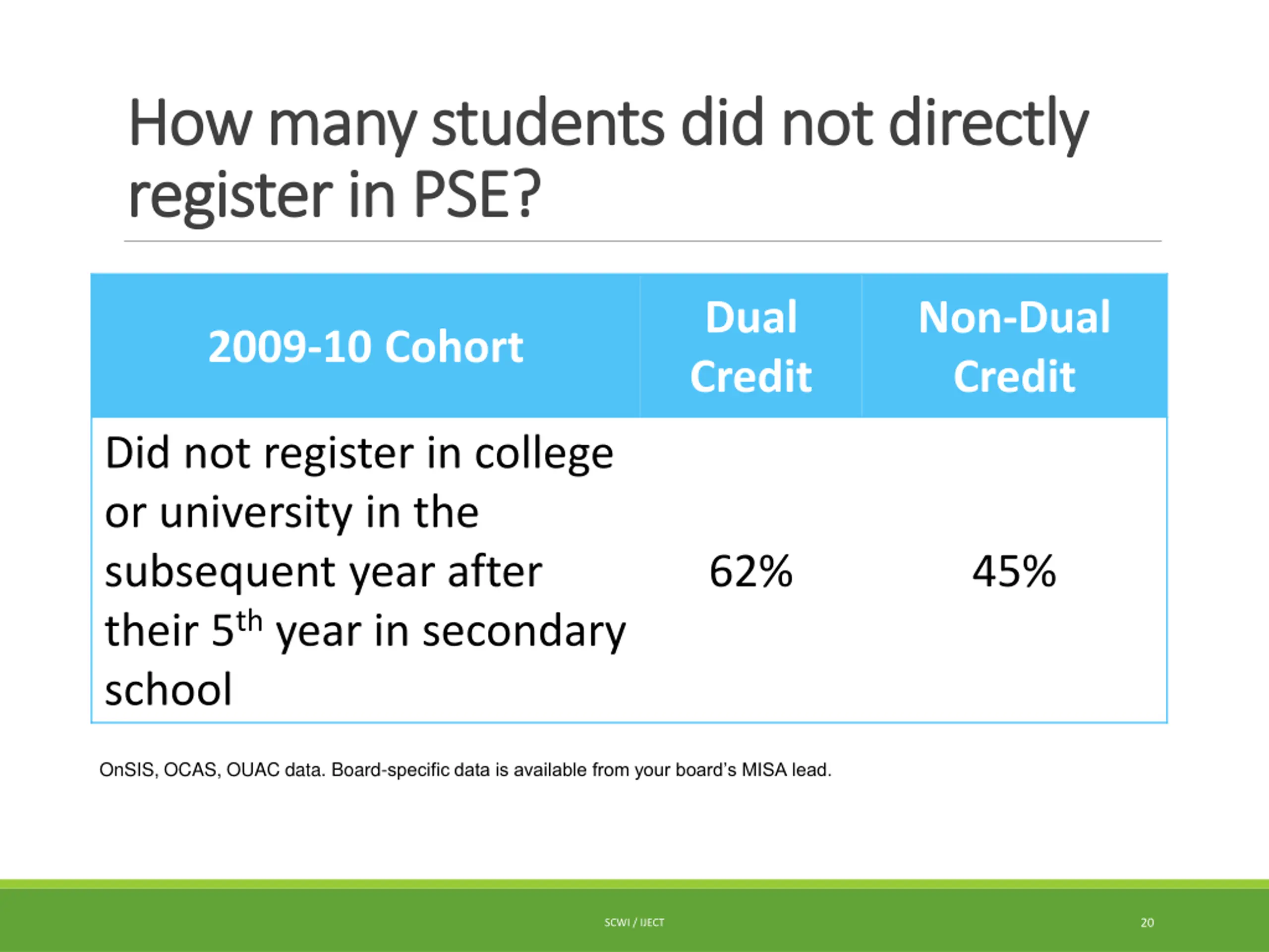 PSE Direct Registration Rates PSE Direct Registration Rates Direct Registration Rate for 2009-10 Cohort Non-Dual Credit Dual Credit College 31% 20% University 7% 35% Note: Of the full 2009-10 Grade 9 Cohort, 33022 (20%) students registered directly to college. OnSIS, OCAS, OUAC data. 19 SCWI / IJECT