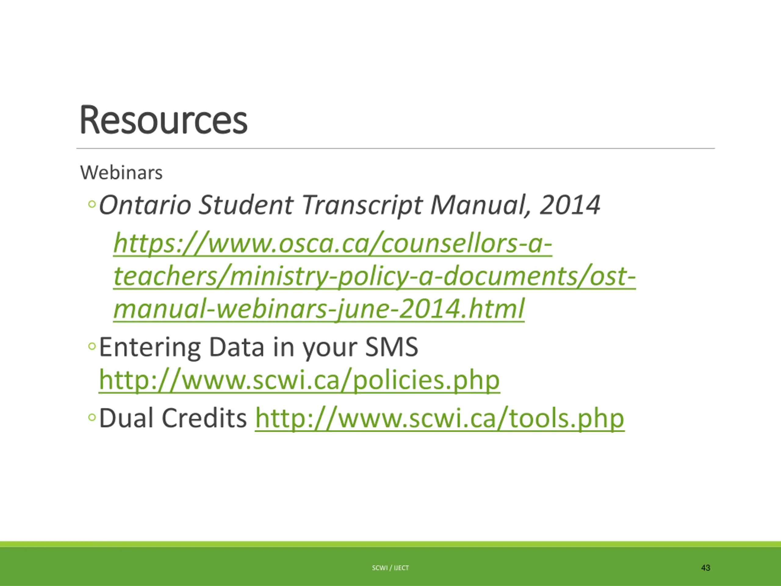 Resources Resources Webinars Ontario Student Transcript Manual, 2014 https://www.osca.ca/counsellors-a- teachers/ministry-policy-a-documents/ost- manual-webinars-june-2014.html Entering Data in your SMS http://www.scwi.ca/policies.php Dual Credits http://www.scwi.ca/tools.php 43 SCWI / IJECT
