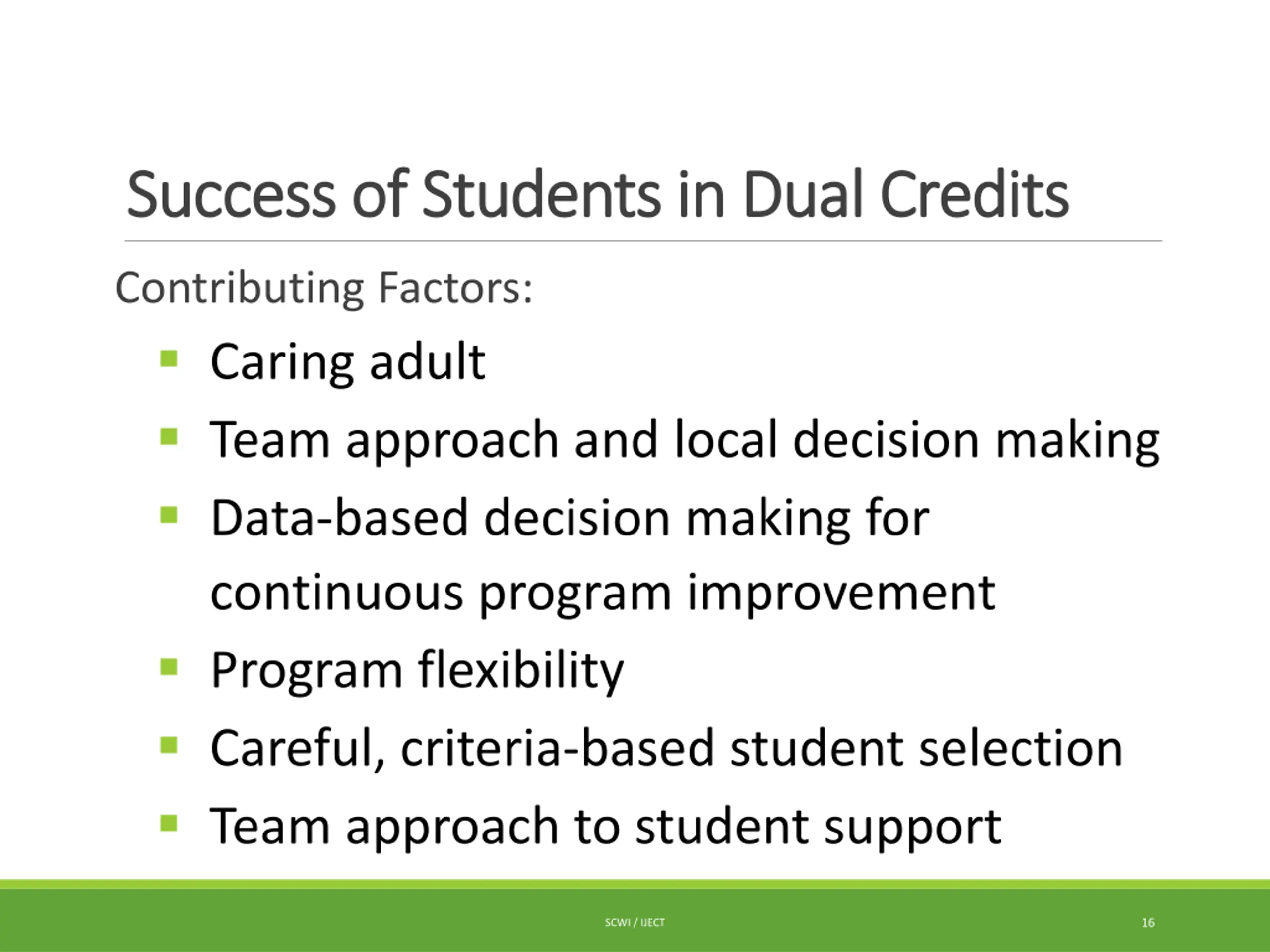 Success of Students in Dual Credits Success of Students in Dual Credits Contributing Factors: Caring adult Team approach and local decision making Data-based decision making for continuous program improvement Program flexibility Careful, criteria-based student selection Team approach to student support 16 SCWI / IJECT
