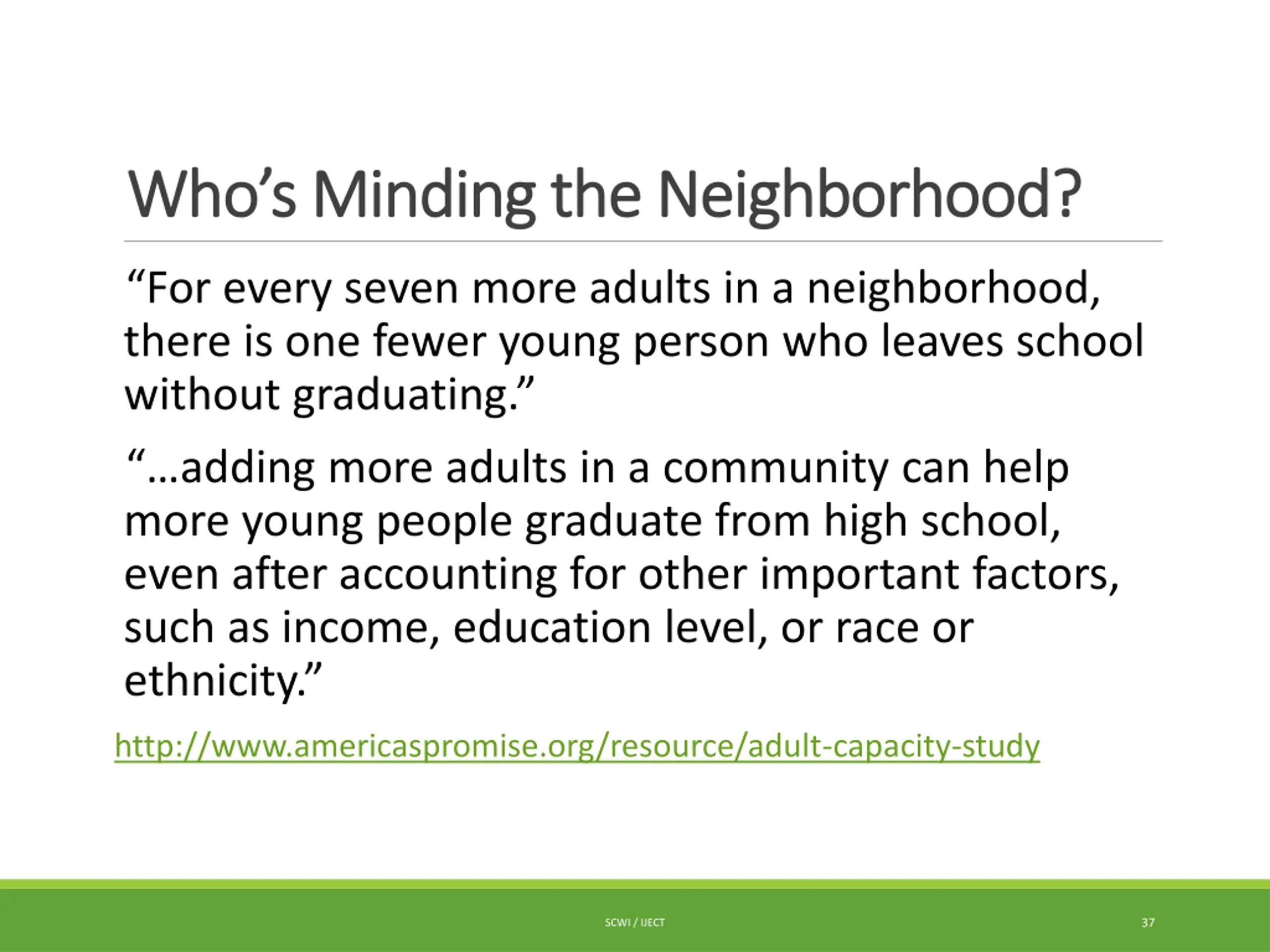 Whos Minding the Neighborhood? Who s Minding the Neighborhood? For every seven more adults in a neighborhood, there is one fewer young person who leaves school without graduating. adding more adults in a community can help more young people graduate from high school, even after accounting for other important factors, such as income, education level, or race or ethnicity. http://www.americaspromise.org/resource/adult-capacity-study 37 SCWI / IJECT