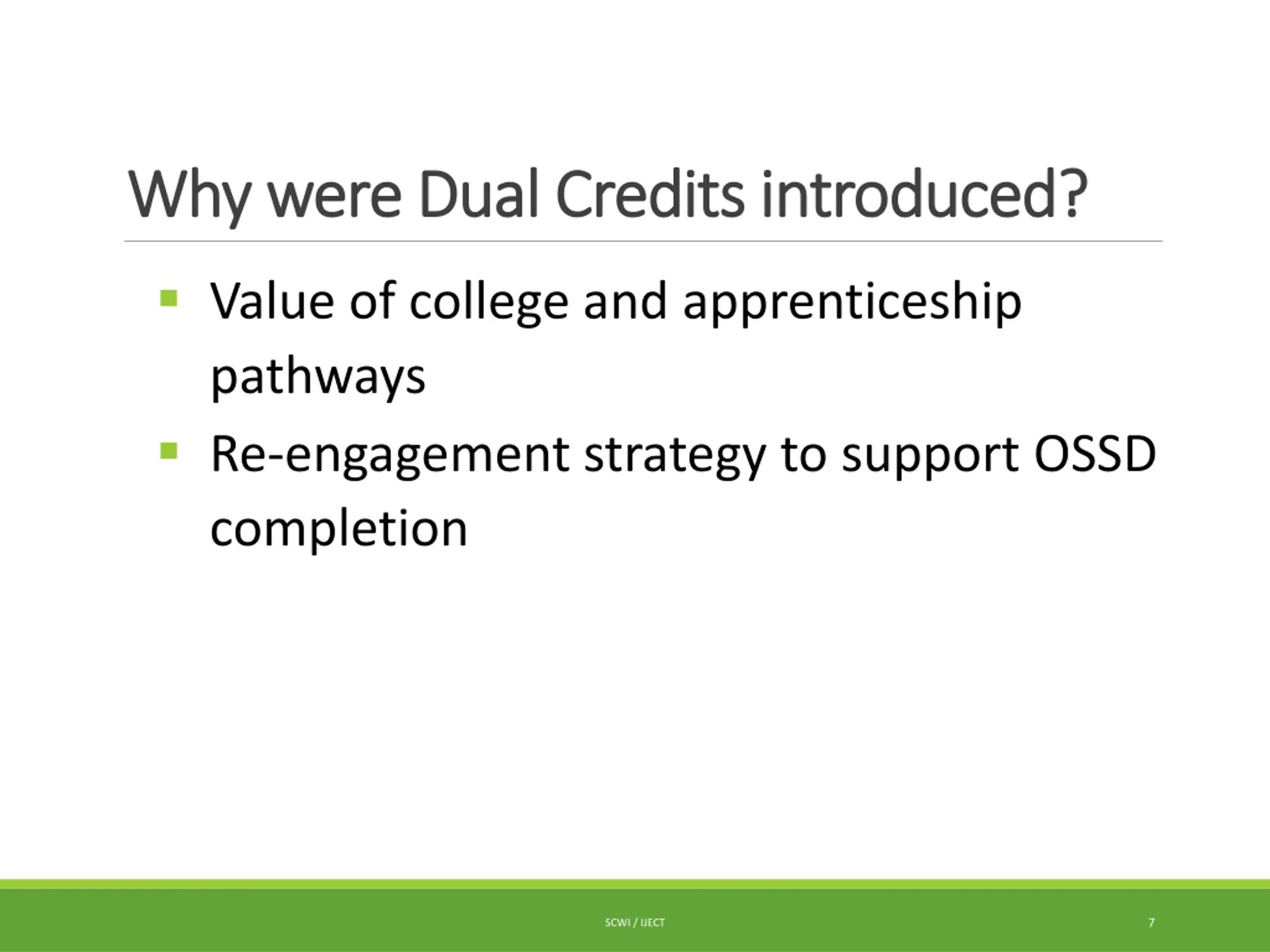 Why were Dual Credits introduced? Why were Dual Credits introduced? Value of college and apprenticeship pathways Re-engagement strategy to support OSSD completion 7 SCWI / IJECT
