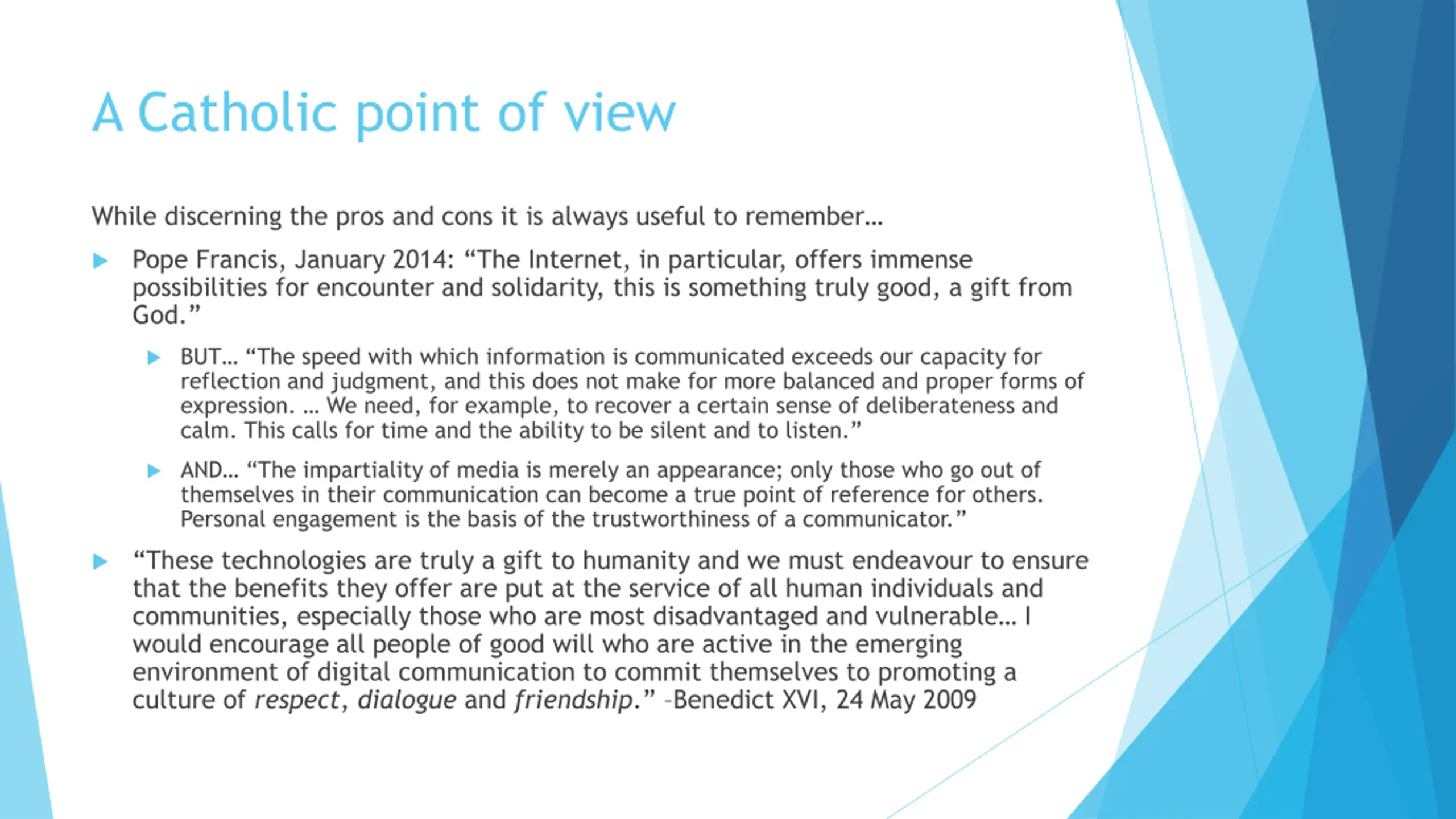 A Catholic point of view While discerning the pros and cons it is always useful to remember Pope Francis, January 2014: The Internet, in particular, offers immense possibilities for encounter and solidarity, this is something truly good, a gift from God. BUT The speed with which information is communicated exceeds our capacity for reflection and judgment, and this does not make for more balanced and proper forms of expression. We need, for example, to recover a certain sense of deliberateness and calm. This calls for time and the ability to be silent and to listen. AND The impartiality of media is merely an appearance; only those who go out of themselves in their communication can become a true point of reference for others. Personal engagement is the basis of the trustworthiness of a communicator. These technologies are truly a gift to humanity and we must endeavour to ensure that the benefits they offer are put at the service of all human individuals and communities, especially those who are most disadvantaged and vulnerable I would encourage all people of good will who are active in the emerging environment of digital communication to commit themselves to promoting a culture of respect, dialogue and friendship. Benedict XVI, 24 May 2009