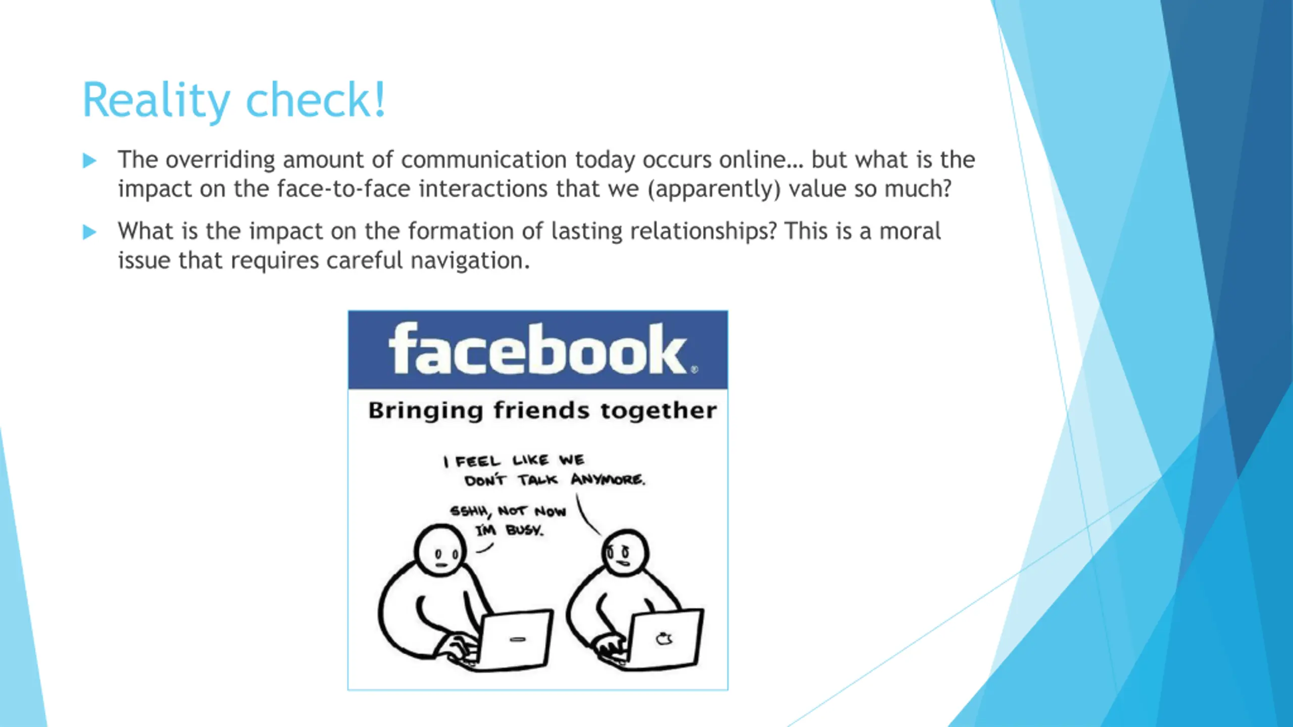 Reality check! The overriding amount of communication today occurs online but what is the impact on the face-to-face interactions that we (apparently) value so much? What is the impact on the formation of lasting relationships? This is a moral issue that requires careful navigation.
