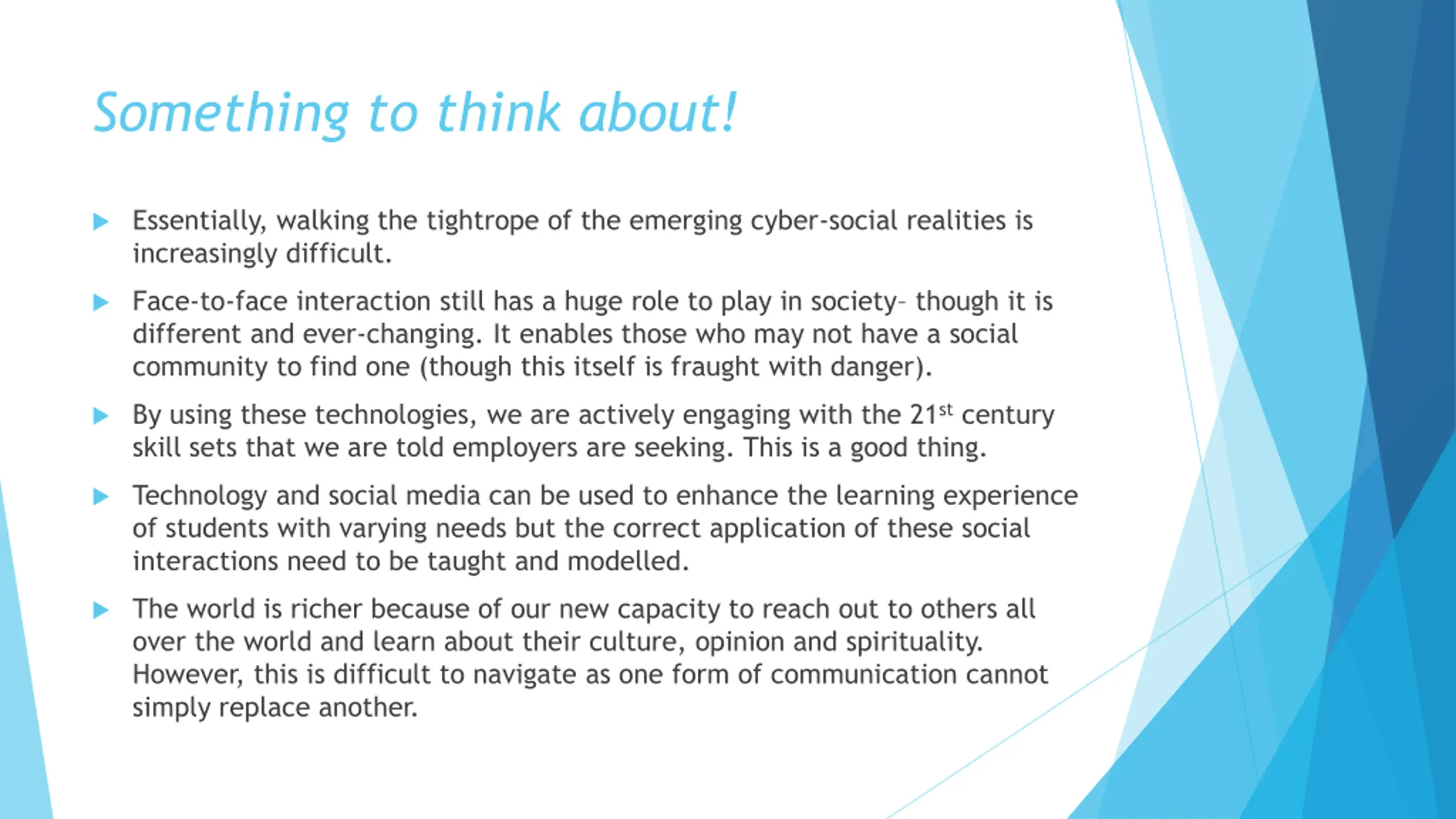 Something to think about! Essentially, walking the tightrope of the emerging cyber-social realities is increasingly difficult. Face-to-face interaction still has a huge role to play in society though it is different and ever-changing. It enables those who may not have a social community to find one (though this itself is fraught with danger). By using these technologies, we are actively engaging with the 21st century skill sets that we are told employers are seeking. This is a good thing. Technology and social media can be used to enhance the learning experience of students with varying needs but the correct application of these social interactions need to be taught and modelled. The world is richer because of our new capacity to reach out to others all over the world and learn about their culture, opinion and spirituality. However, this is difficult to navigate as one form of communication cannot simply replace another.