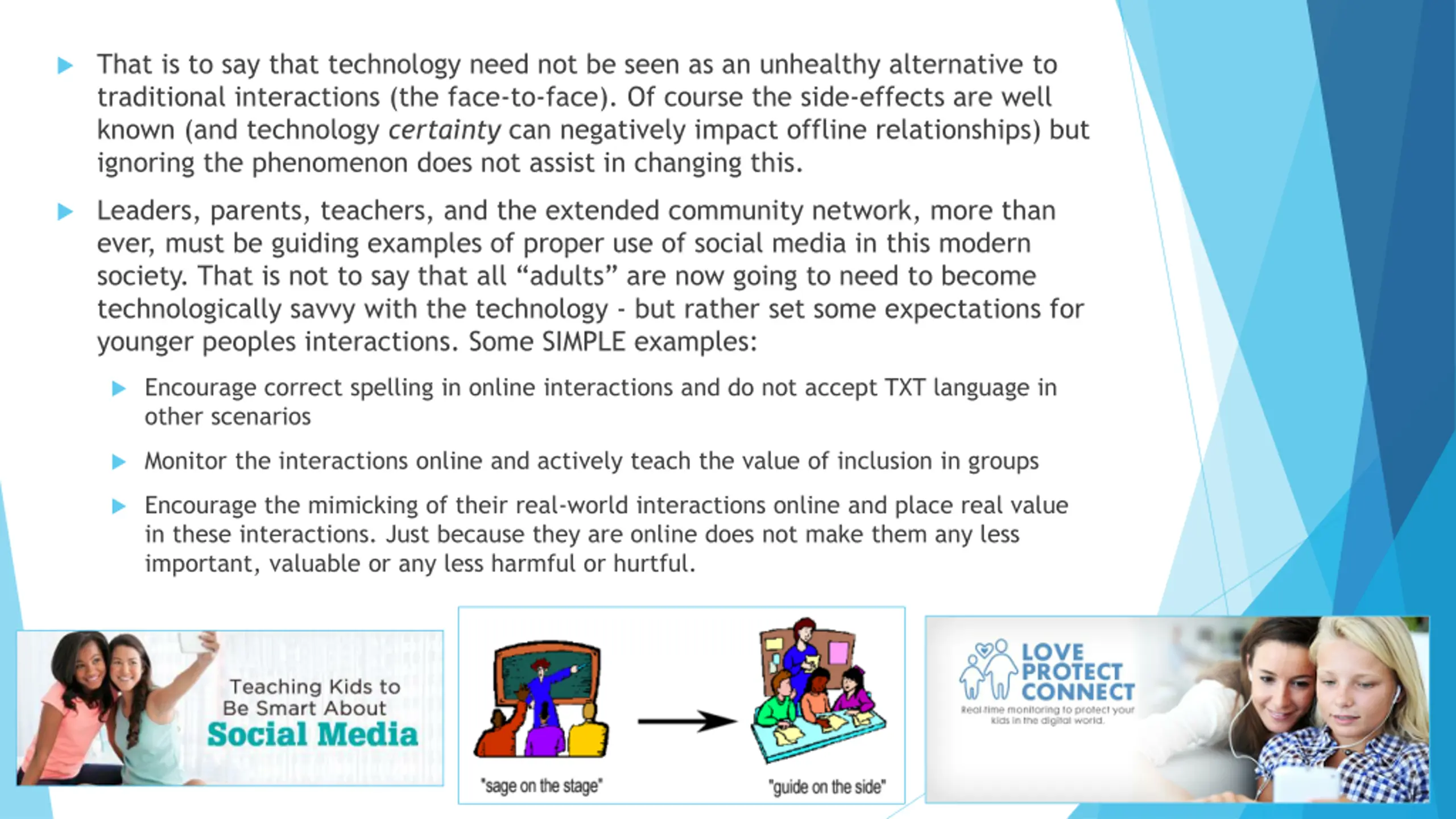 That is to say that technology need not be seen as an unhealthy alternative to traditional interactions (the face-to-face). Of course the side-effects are well known (and technology certainty can negatively impact offline relationships) but ignoring the phenomenon does not assist in changing this. Leaders, parents, teachers, and the extended community network, more than ever, must be guiding examples of proper use of social media in this modern society. That is not to say that all adults are now going to need to become technologically savvy with the technology - but rather set some expectations for younger peoples interactions. Some SIMPLE examples: Encourage correct spelling in online interactions and do not accept TXT language in other scenarios Monitor the interactions online and actively teach the value of inclusion in groups Encourage the mimicking of their real-world interactions online and place real value in these interactions. Just because they are online does not make them any less important, valuable or any less harmful or hurtful.