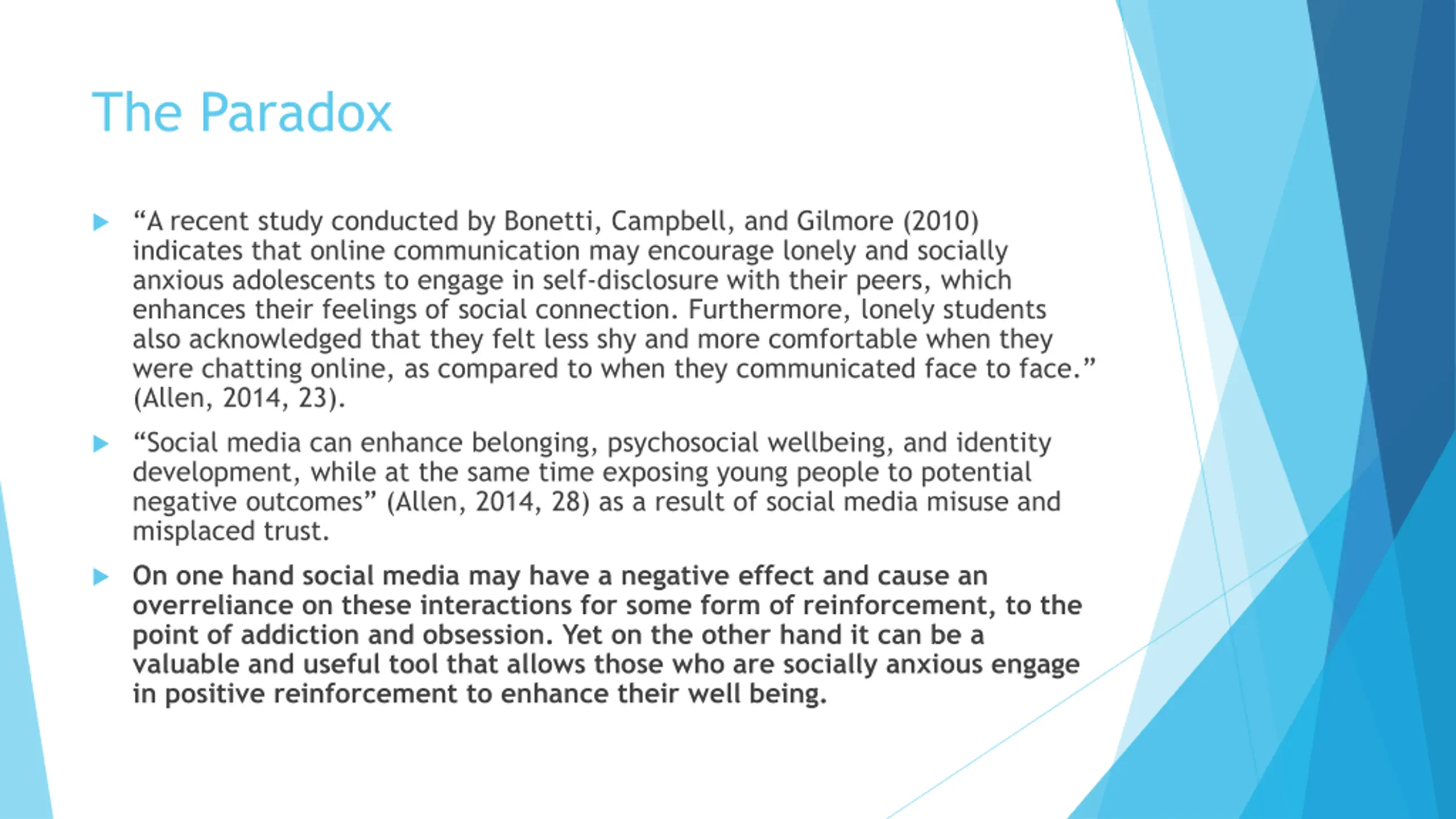 The Paradox A recent study conducted by Bonetti, Campbell, and Gilmore (2010) indicates that online communication may encourage lonely and socially anxious adolescents to engage in self-disclosure with their peers, which enhances their feelings of social connection. Furthermore, lonely students also acknowledged that they felt less shy and more comfortable when they were chatting online, as compared to when they communicated face to face. (Allen, 2014, 23). Social media can enhance belonging, psychosocial wellbeing, and identity development, while at the same time exposing young people to potential negative outcomes (Allen, 2014, 28) as a result of social media misuse and misplaced trust. On one hand social media may have a negative effect and cause an overreliance on these interactions for some form of reinforcement, to the point of addiction and obsession. Yet on the other hand it can be a valuable and useful tool that allows those who are socially anxious engage in positive reinforcement to enhance their well being.